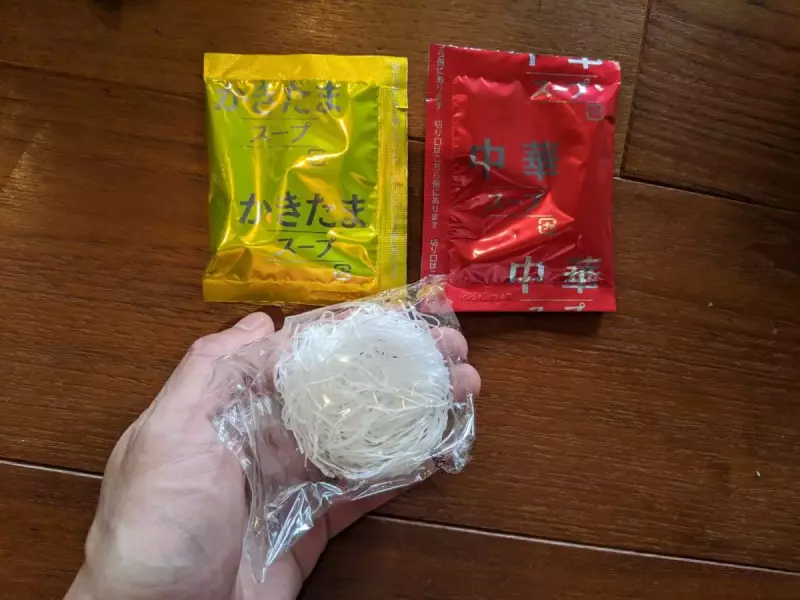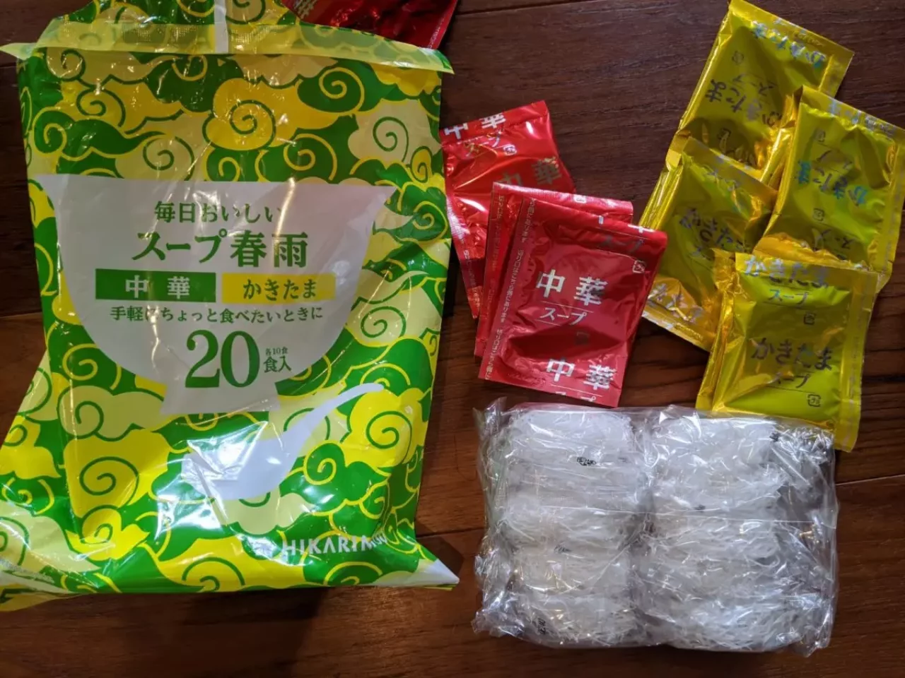 スープ春雨には手のひら半分サイズの小さな春雨が袋詰されています。このサイズがとてもよくて、ちょっと小腹が空いたときに大活躍してくれます。中華スープ、かきたま、春雨をお湯に入れて完成ですが、鍋の〆にしても美味しいです。
