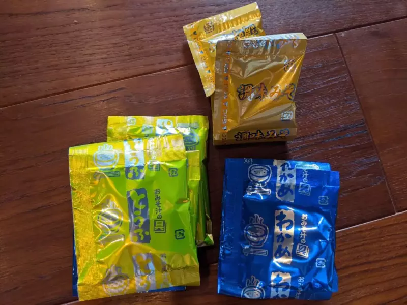 合わせ味噌はわかめ&とうふ、長ねぎ&油揚げという2種類で、お味噌は調味味噌といって、米みそ以外に、かつおエキスや昆布エキスなどの調味料が含まれています。これらをお湯に投入してかき混ぜれば出来上がりです。