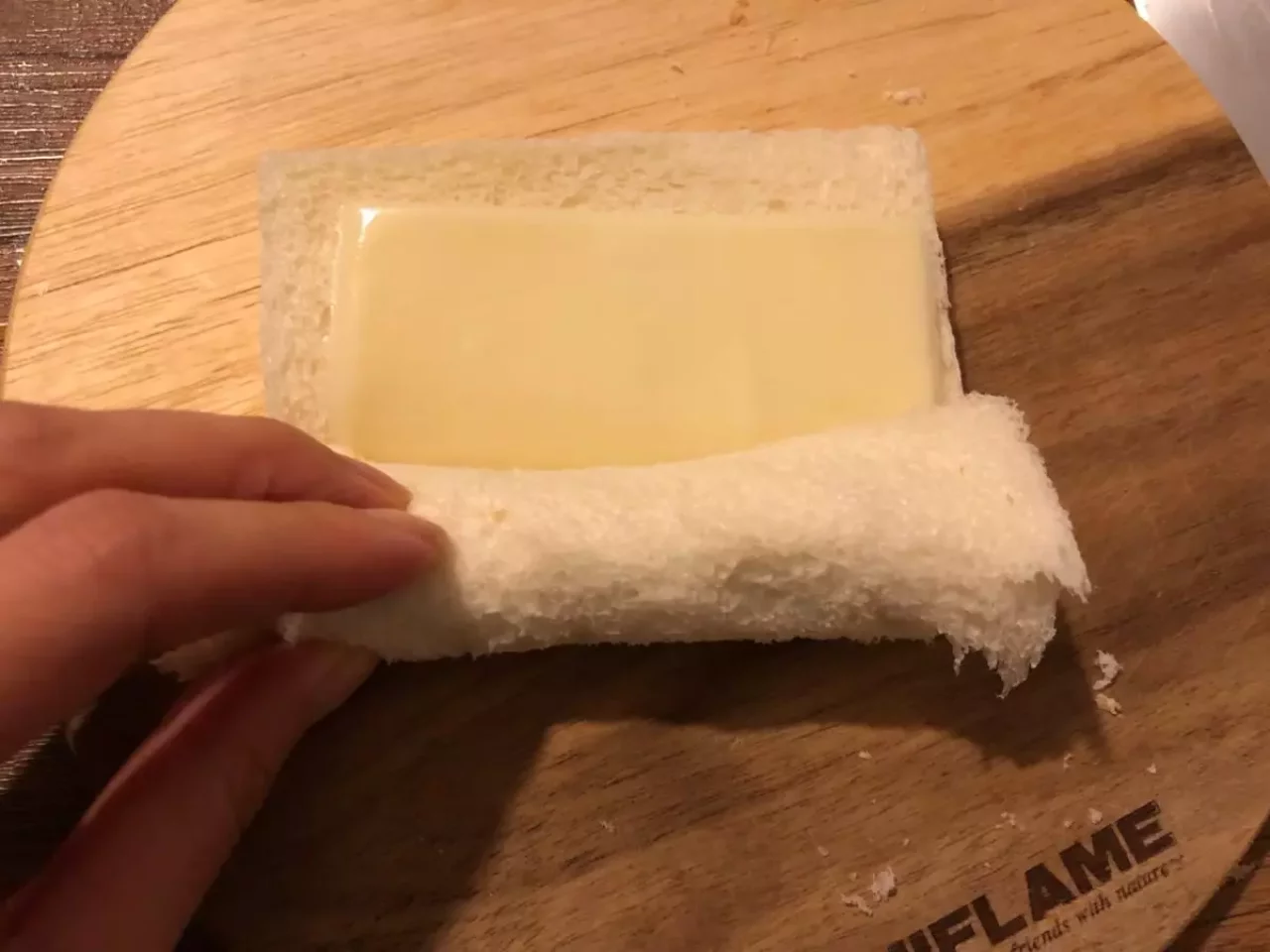 パンにとろけるチーズをのせて、クルクルと巻いていきます。