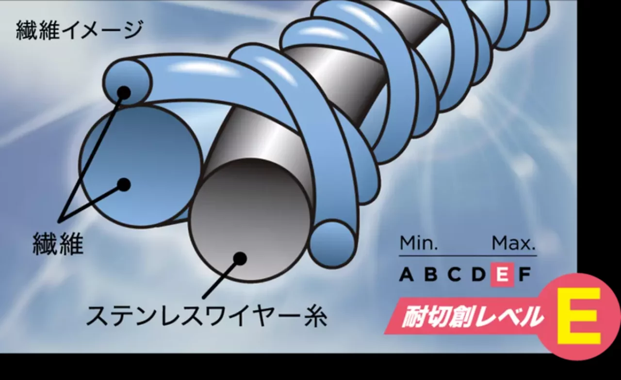 ステンレスワイヤー糸とアラミド(強度に優れた人工繊維)を組み合わせた繊維を使用することで、優れた耐切創性を実現しながら、ゴワツキを抑え、やわらかく手にフィットするグローブに仕上がっている。発泡樹脂コーティングにより、手のひら部分にも通気性を持たせ、ムレを軽減した点も特長のひとつ。