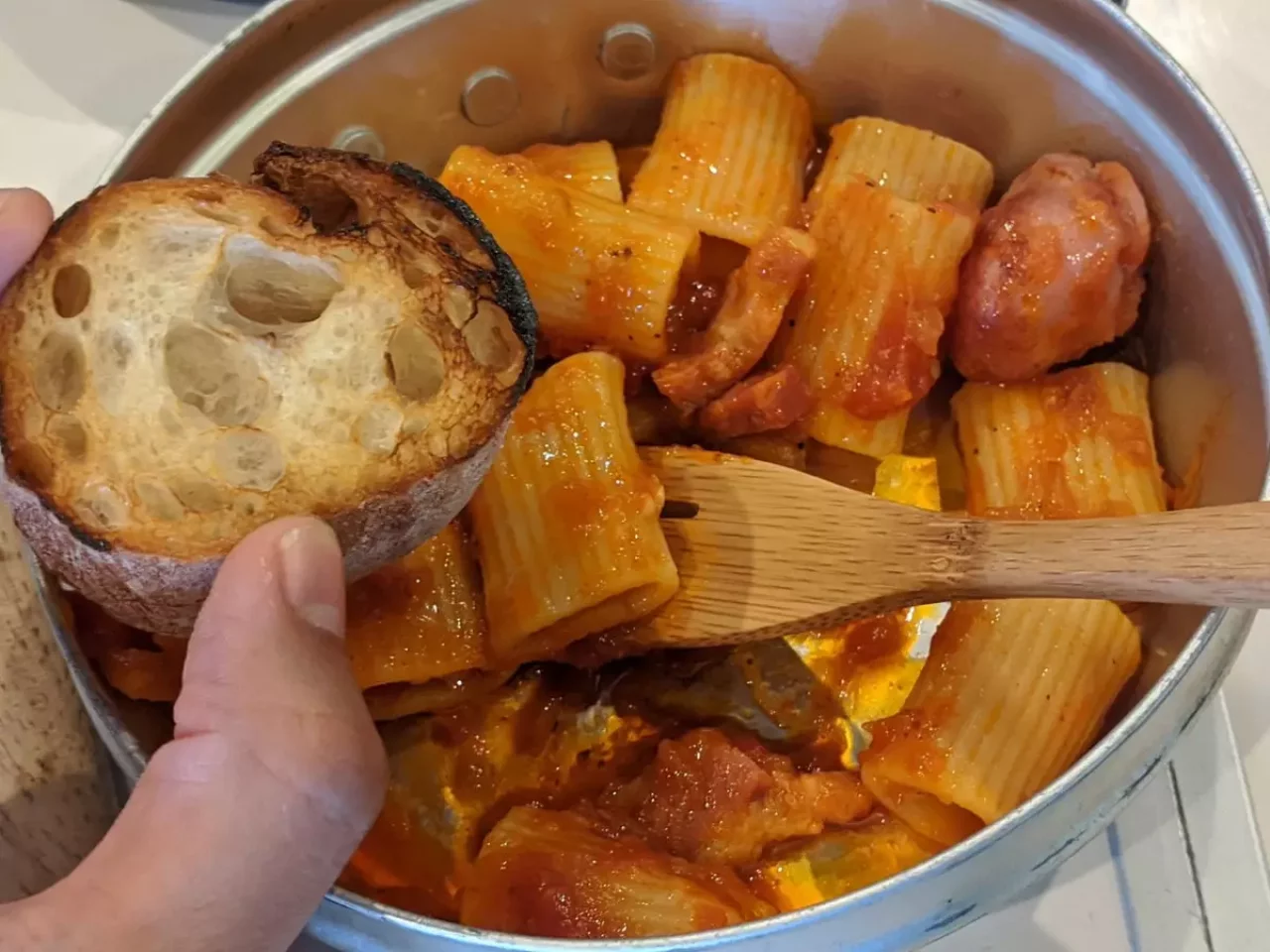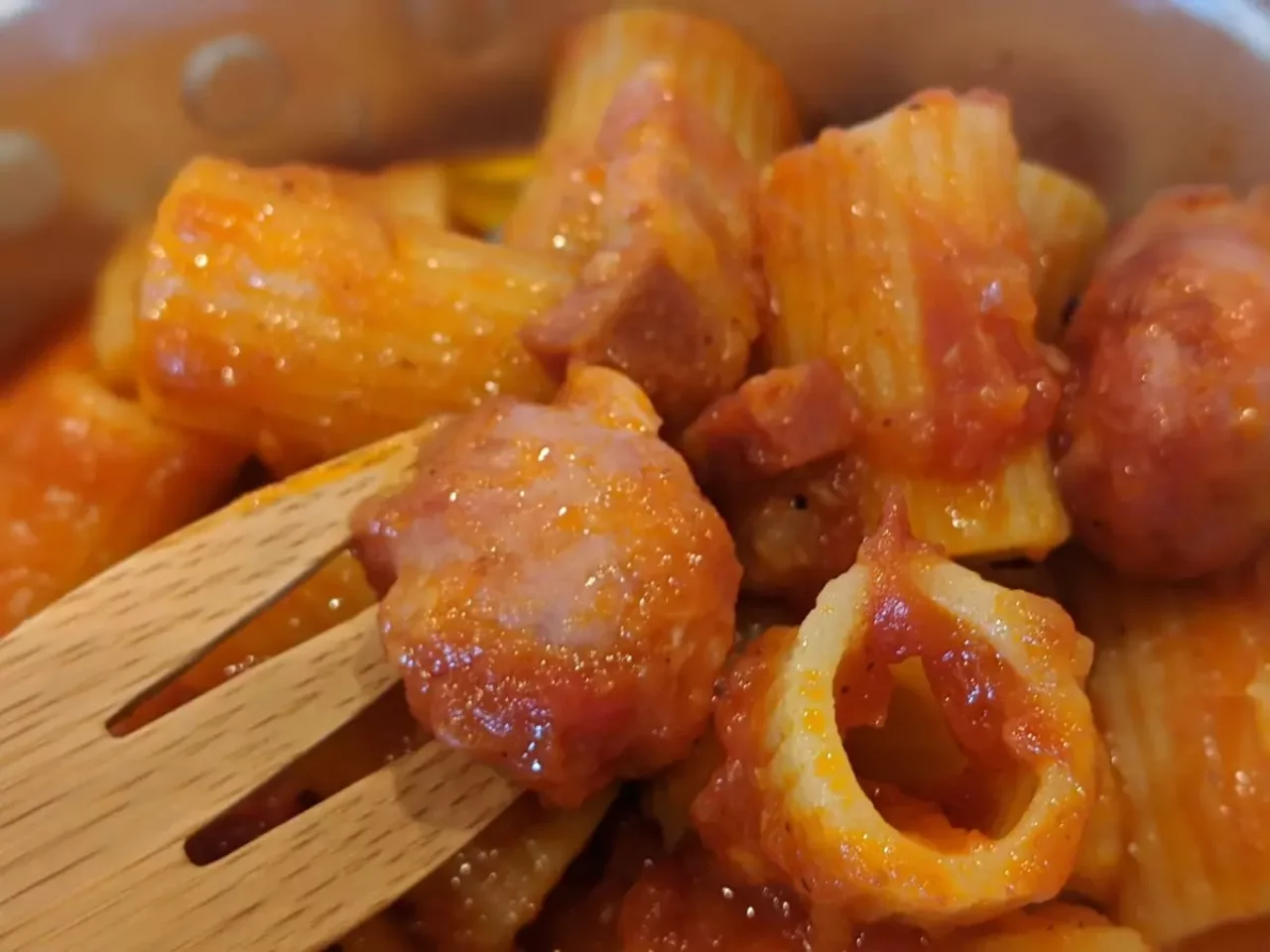 こちらはリガトーニ、1袋が164gという容量。粗挽きソーセージがまるっと入っており、厚切りベーコンも味の決め手となっている。