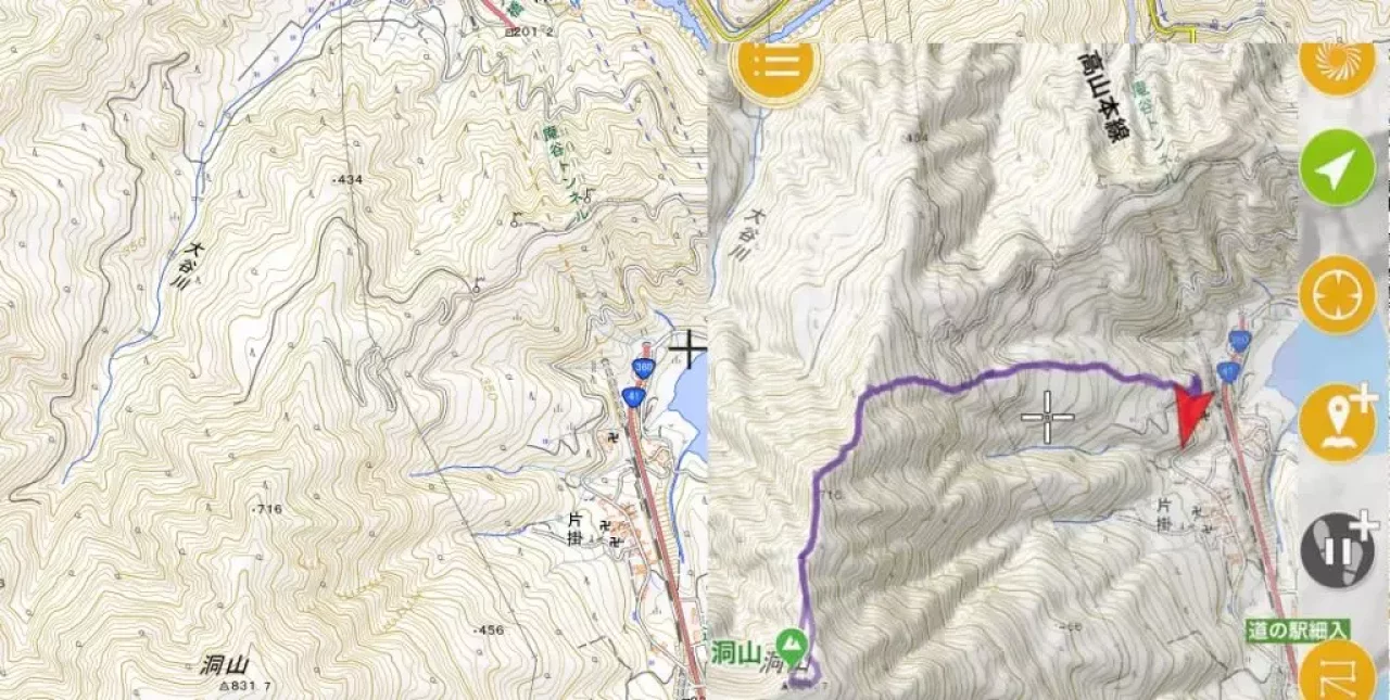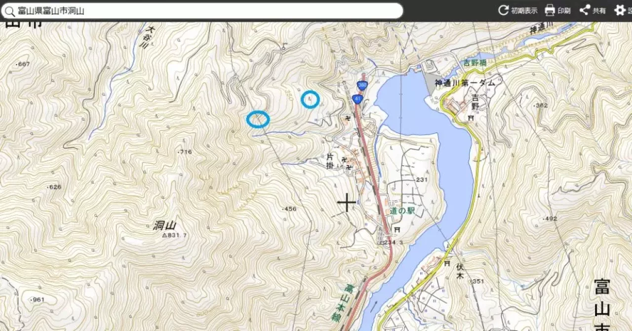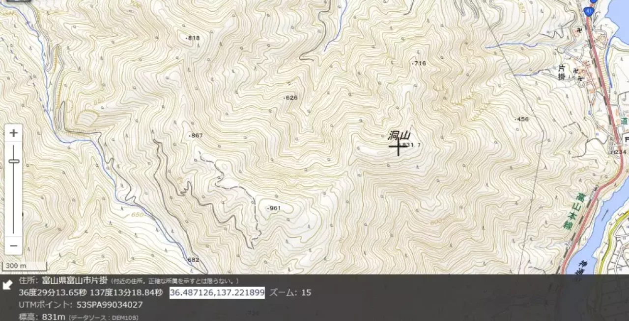 上部の虫眼鏡の検索窓に山の名前を入力します。もちろん、初期画面からマウスのスクロールホイールでズームして到達してもOKです。では、図中の「洞山」を登ることにしましょう。みなさんなら、どんなルートで登りますか?