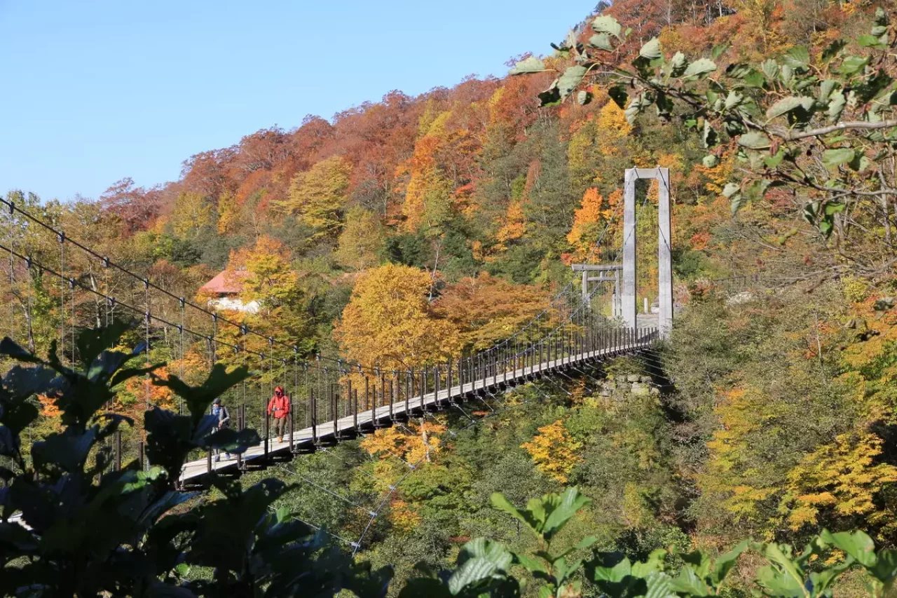 山中の温泉街に沿って流れる大聖寺川の渓谷で、その美しさは北陸随一と言われます。約1.3kmの渓谷沿いの区間は遊歩道が整備され、川を眺めながらゆっくり歩くことができます。総ひのき造りの風情あるこおろぎ橋や、S字型の斬新なデザインのあやとりはしなどの人気観光地も、紅葉深まる秋にはより一層美しい姿を楽しめます。