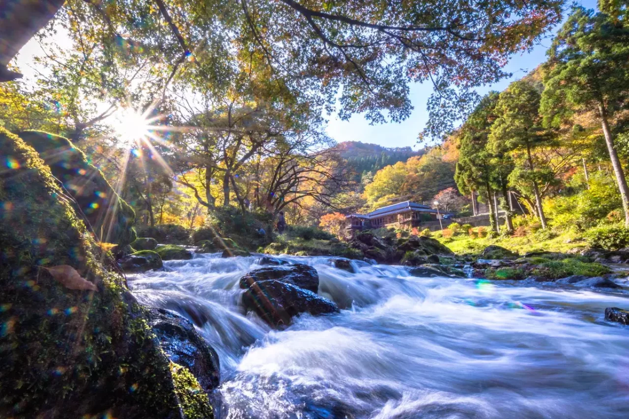 「加能八景」の一つにも数えられる景勝地。蛇行した大杉谷川の流れと、河畔に点在する奇岩や連なる樹々など、渓谷が生み出した自然美に触れることができます。400mほどの遊歩道も整備され紅葉の季節は散策する人で賑わいます。澄んだ水面に鮮やかん紅葉が反射し、渓谷美を演出します。