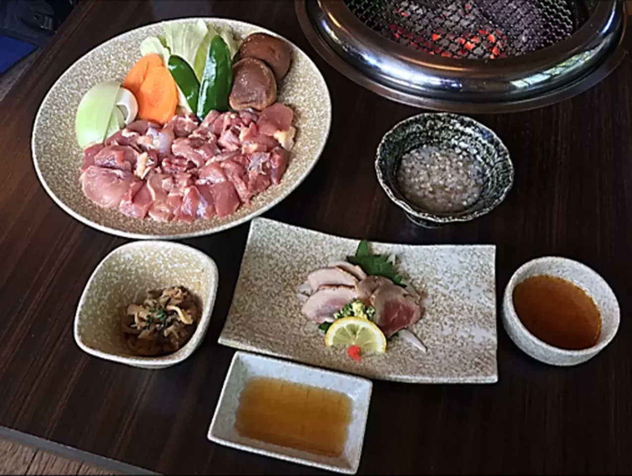 塚原高原のお食事処の中でも、おいしい地鶏が食べられる隠れた名店をご案内します。ご紹介するのは「地鶏炭火焼塚原の里」。遠方から訪れるお客さんも多い人気のお店です。店内は古民家風の造りになっており、自分でお肉を焼いて食べるスタイルになっています。メニューには、大分県のブランド牛おおいた和牛やイノシシ肉などがありますが、中でも人気のメニューは「炭火焼地どり定食」です。運ばれてきたお肉は、新鮮なことが分かる綺麗なピンク色で、ほどよく脂がのっています。炭火によって、質の良いお肉にゆっくりと火を通すため、焼き上がりは柔らかく、鶏肉本来の旨味を逃がしません。