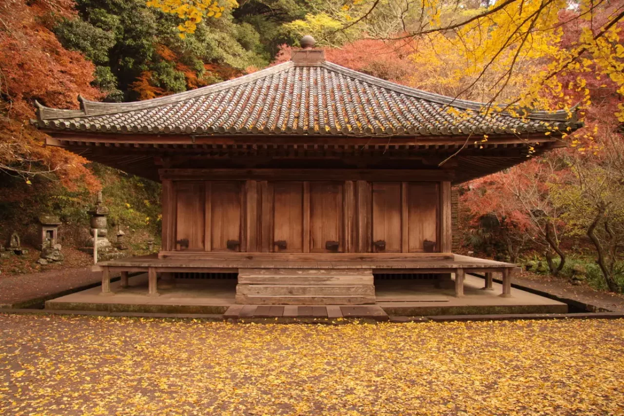 富貴寺は、平安時代に宇佐神宮大宮司の氏寺として開かれた由緒ある寺院です。中でも国宝に指定されている富貴寺大堂は、宇治の平等院鳳凰堂、平泉の中尊寺金色堂と並ぶ日本三阿弥陀堂のひとつであり、現存する九州最古の木造建築物です。堂内に収められた本尊の阿弥陀如来像も国重要文化財に指定されています。境内一面が紅葉で染まる姿は圧巻の美しさです。