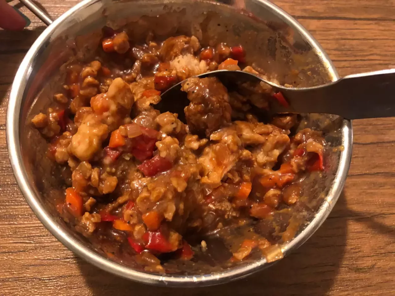 チーズハンバーグとタコスミートをシェラカップにいれてかき混ぜます。美味しく濃い味同士が混ざるので、味どうかな?と思ったんですが、問題なしです!
