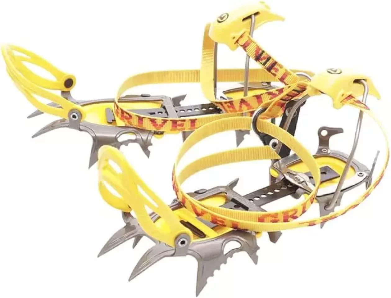 爪がやや短めで岩場でも歩きやすい縦走用12本爪。3番目が幅広でトラバース時にも安定感があります。つま先はプラスチックハーネス、踵はバインディング止めです。