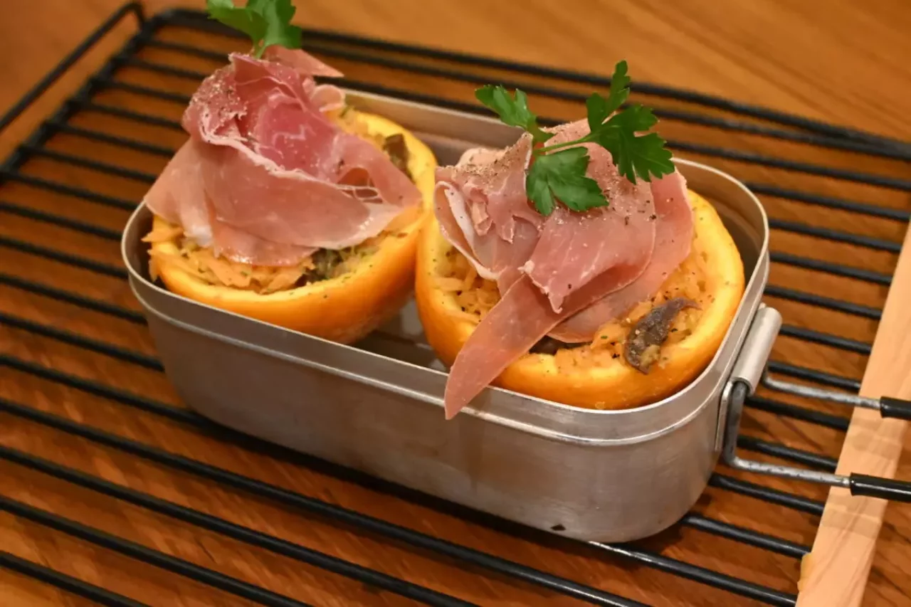 網の上にサラダを入れたオレンジを乗せて、メスティンにワインを入れ蓋をして5分蒸す。蒸し終わったら生ハムを乗せて完成。最後にコショウをふる。