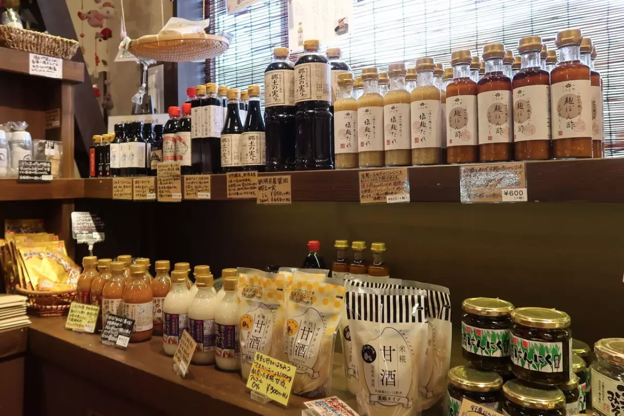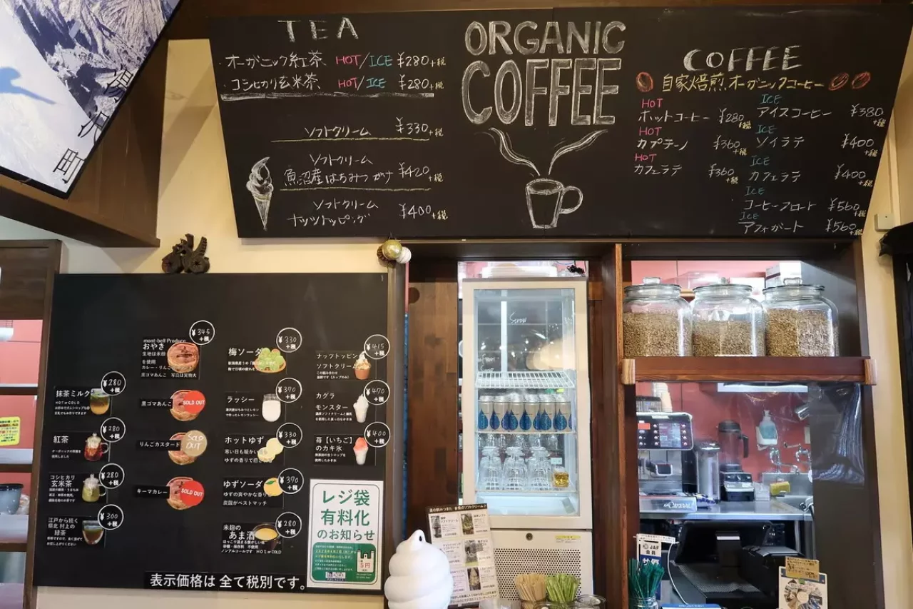 カフェは無農薬栽培の自家焙煎コーヒーがおススメ。こしひかりを使用した玄米茶や魚沼そば茶など、地酒や越後ワインも。おやつには濃厚ソフトクリームに三俣産ハチミツをたっぷりかけたパンケーキやmont-bellプロデュースの米粉おやきも。