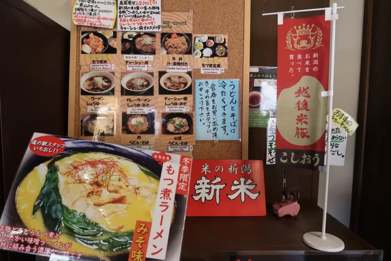 魚沼の逸品素材にこだわったレストランコーナー。おすすめは何といっても、トロトロの「もつ煮!」