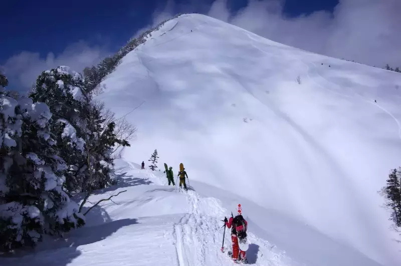 かぐらバックカントリーを行くライダーたち、正面は霧の塔、通称三角。