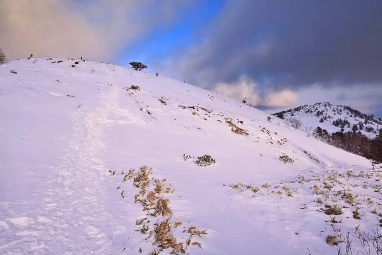 一度鞍部まで一気に下りそこから再び登り返すコースとなっている。下りの道も上りの道も、冬が織りなす景色は絶景だ。