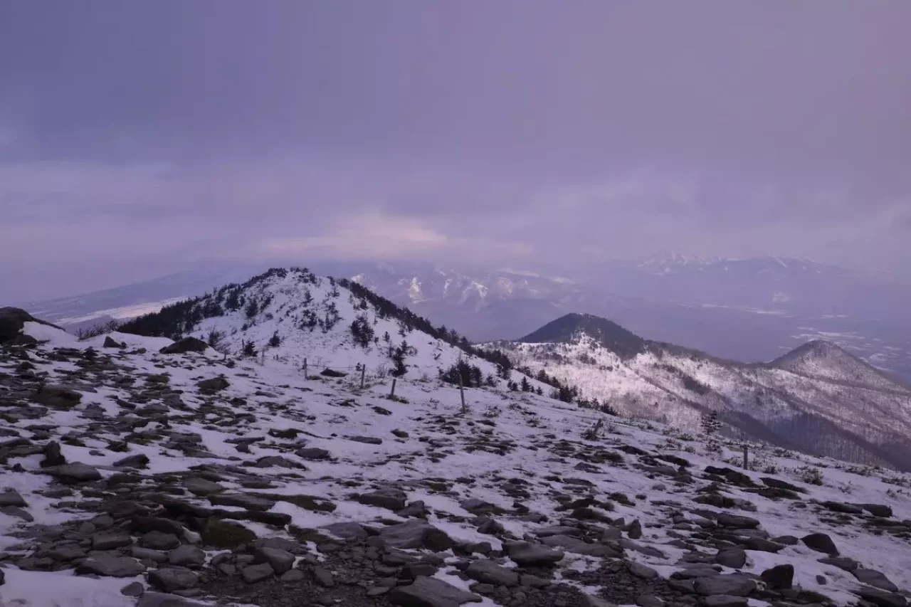 湯ノ丸山頂上へ到着すると冷たく強い風に叩かれる。ハードシェルのフードを被って風を凌ぐも、少し止まるだけで体温が奪われる。