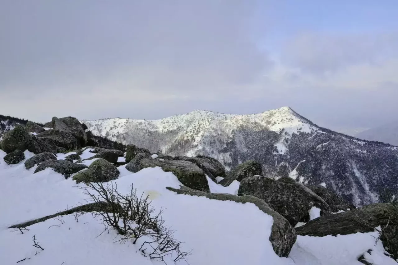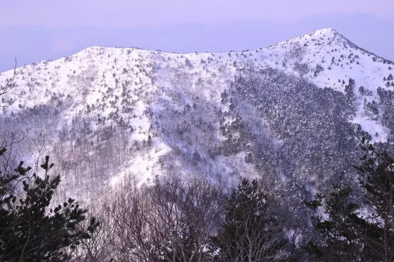 東屋から、雪に覆われた湯ノ丸山の南峰と北峰が見渡せる。これからどんな雪の絶景が楽しめるのか、わくわくするような景色だ。