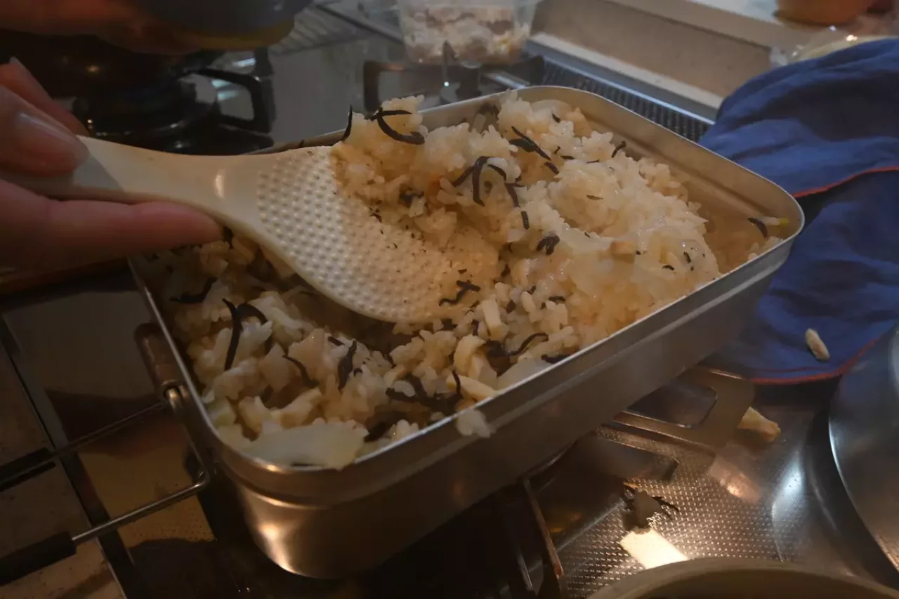 もしも余ったらおにぎりにして次の日の行動食にしてもいいし、メスティンの中にそのまま入れておいて次の日の朝ごはんにしても良いです。