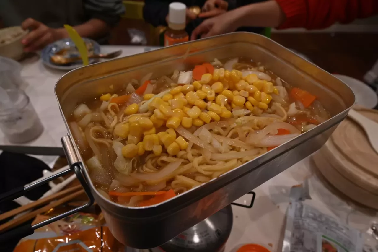 たくさんの野菜を炒めた後に、うどんをのせて調味料とからめて作る焼きうどん。小さなクッカーだと調理しづらいのですが、ラージメスティンを使えば簡単に作ることができます。
