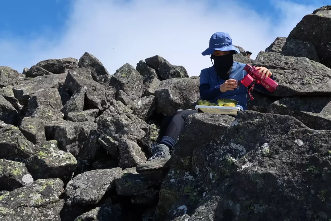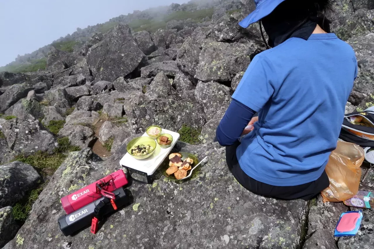頂きでのブレークの時、スタッキングされた標準装備の真空保温構造の内コップがとても役立ちます。