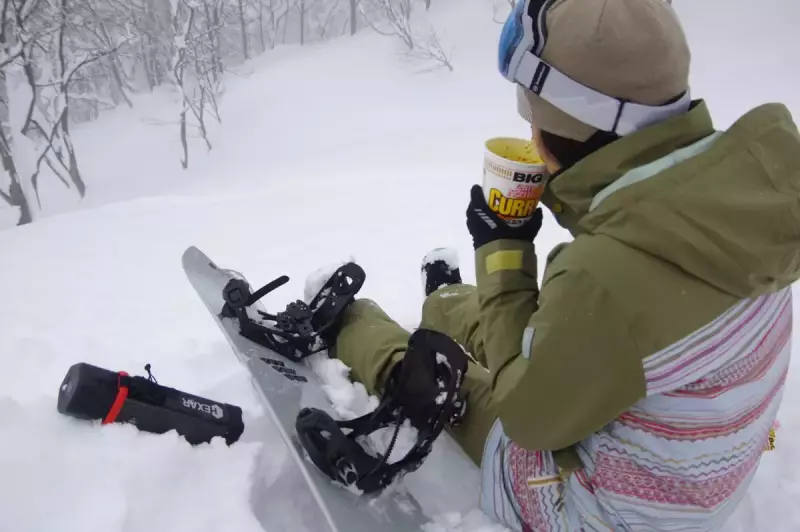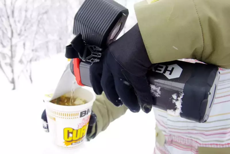 滑走前のランチタイム、厳寒のフィールドで暖かい食事は幸せ感じる時間。六角形のコップはグローブ装着でも保持しやすいです。