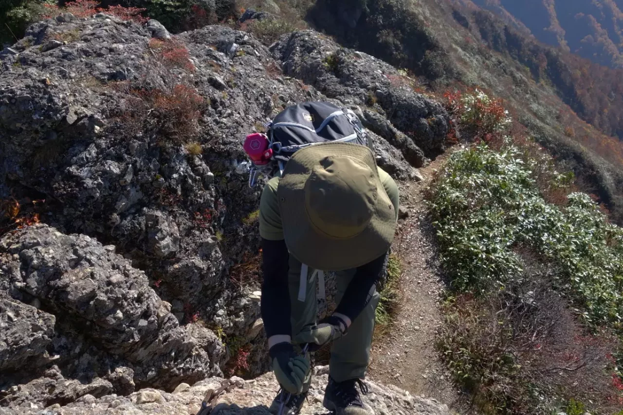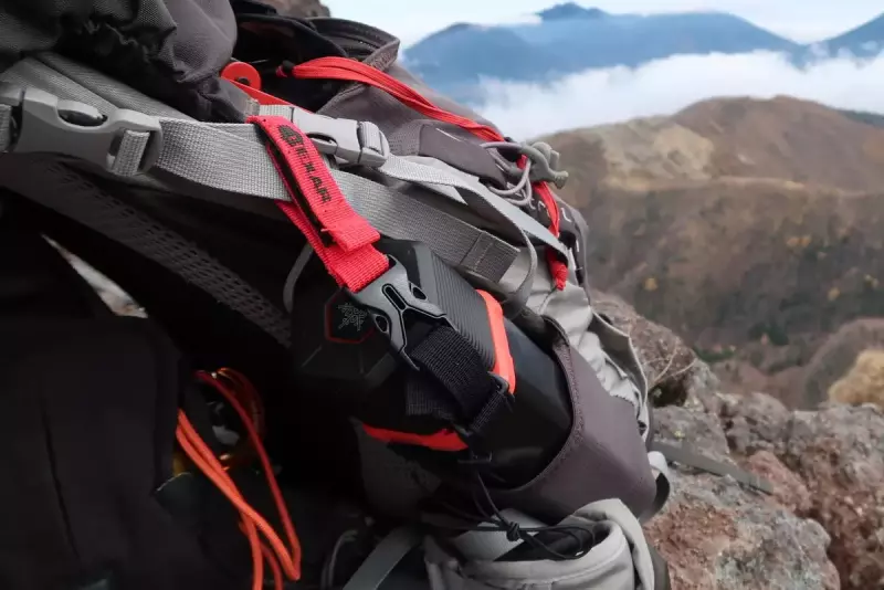 ボトルはサイドポケットに入れると便利ですが、前屈した際にうっかり落としてしまうことがあります。標準装備のリーシュベルトをバックパックのコンプレッションベルトに装着することでサイドポケットからの落下を防ぎます。これも山での安心・安全に繋がる嬉しい装備。