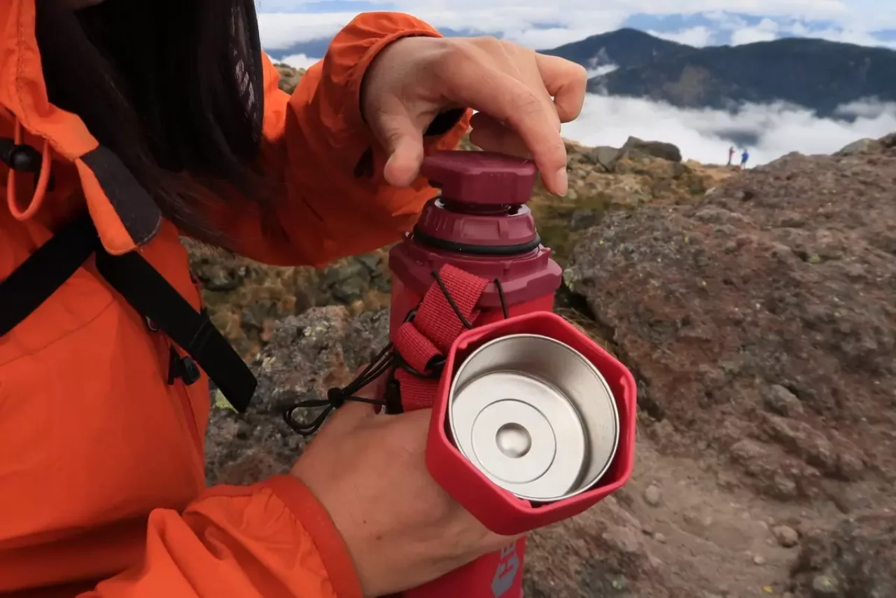 スクリュー栓を開けるには両手が必要なので、普通の山ボトルでは外したコップは周囲に置くしかありませんが、そこが必ずしも安全とも清潔とも限りません。