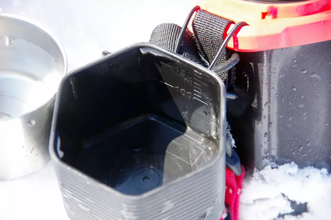 ステンレス製の内コップ容量は100ml、単体重量は50~60gなので、必要ない方は外せば装備重量を減らせます。