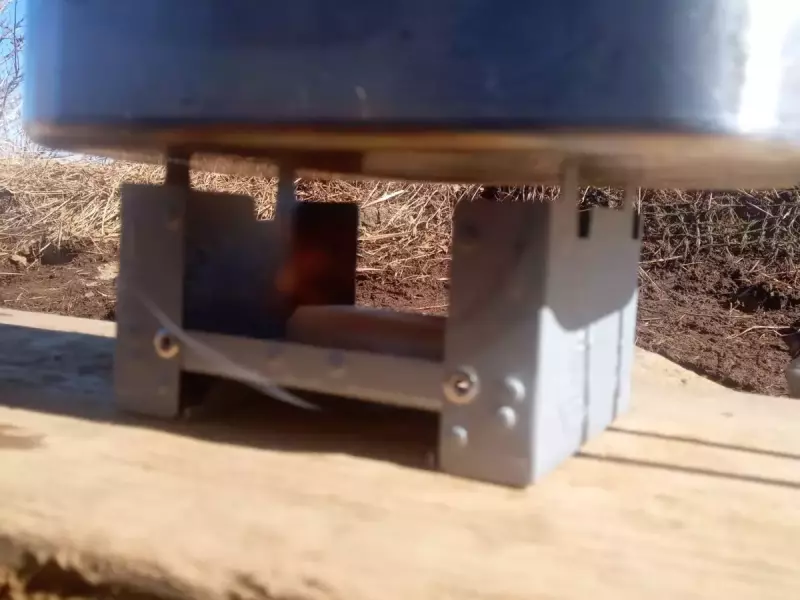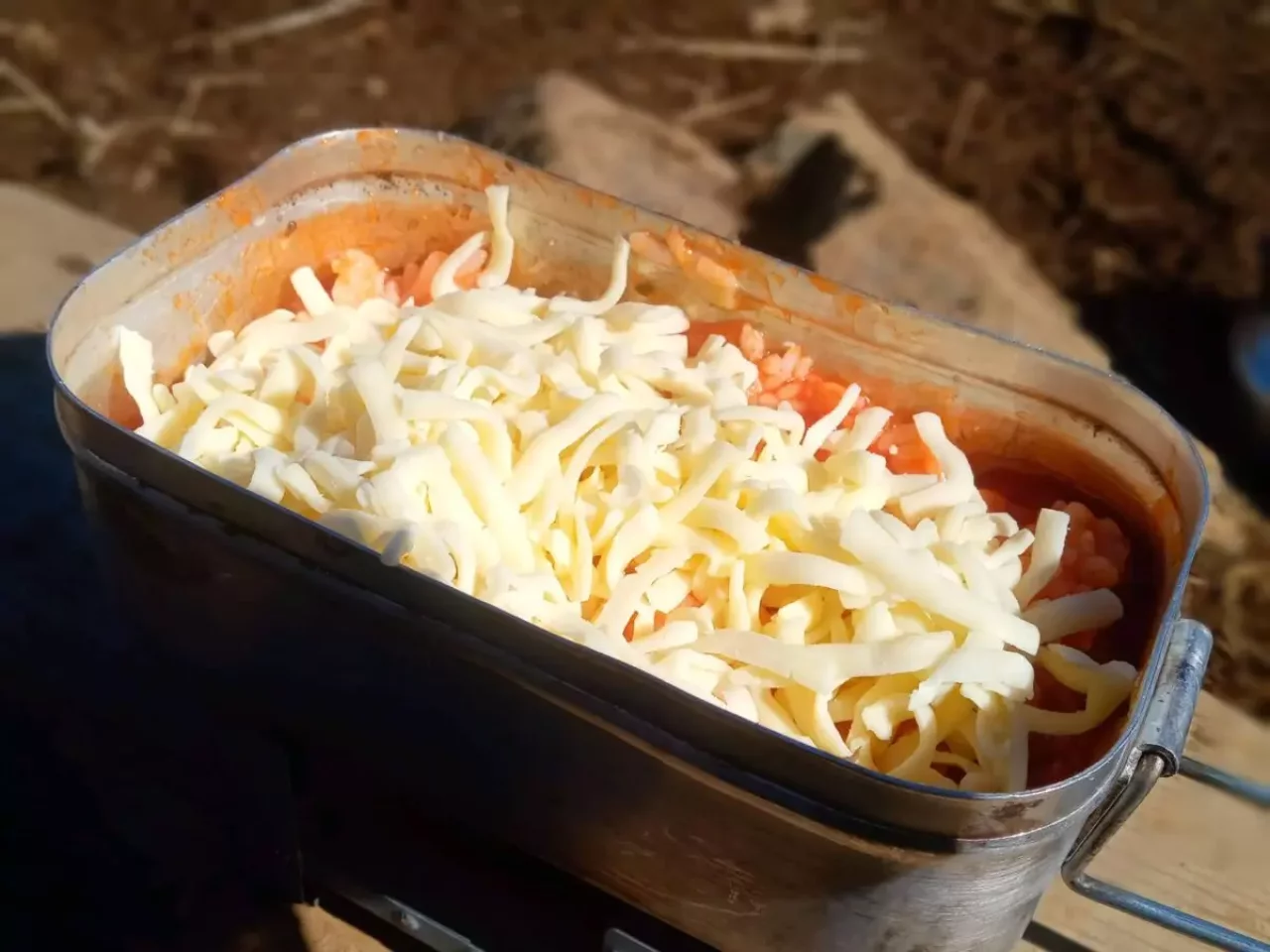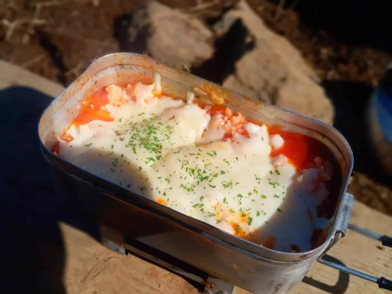 固形燃料に着火して加熱します。今回は14gの固形燃料を2つ使用し、リゾットが温まり、チーズがトロけるまで加熱しました。少し風が強い日だったので燃料の消費も早かったですが、2つ使用すれば問題なく加熱できます。