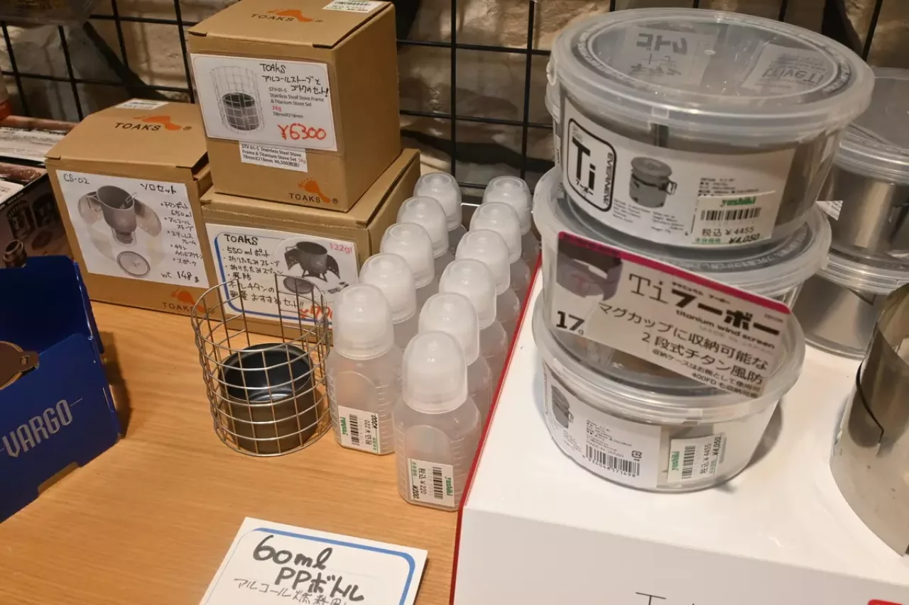 あったとても大きすぎたり、液体がドバッと出てしまうものなど何かしらストレスを感じていて、何か良いものがあればなあ~と思って60mlのPPボトルをお店限定で販売してます。これって多分他のアウトドアショップではなかなかやってないと思うんです。アマゾンで5個単位とかで販売されているのを見かけたことはあるのですが、そんなにいらないですよね?だから1個単位で手に入れたい人の為に準備したんです。欲しい方は是非遊びに来てください。笑