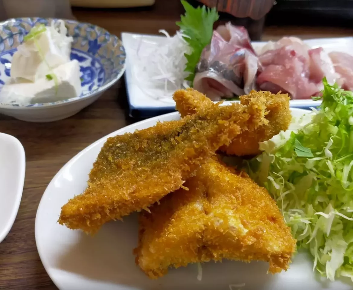 名物は黄金アジを使った料理で行列が絶えない地元の人にも人気の食堂ですおすすめはアジの刺身とアジフライ定食で厚みがすごく脂も乗っていてできればソースをかけずにそのまま食べるのがおすすめです。