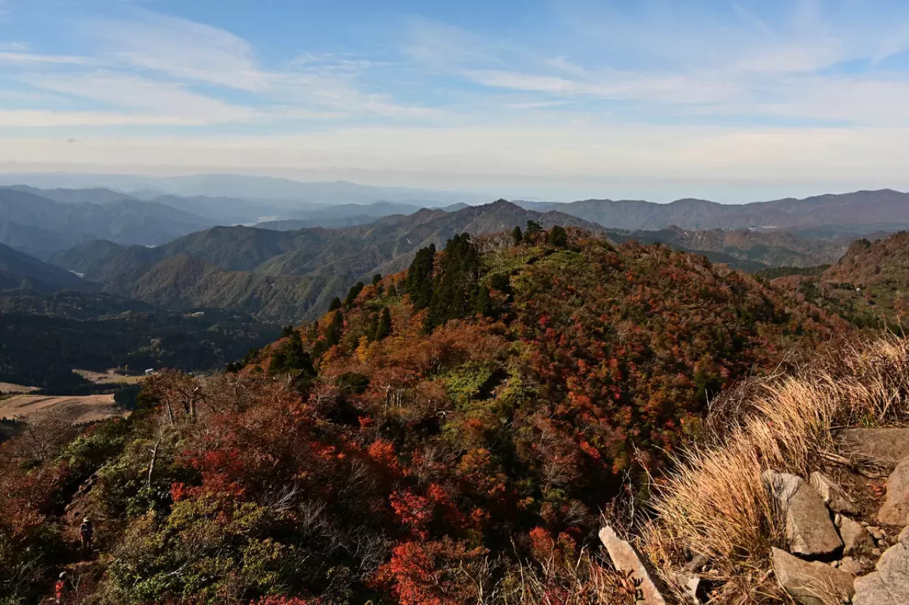 山頂からは周辺の山一帯が紅葉に染まった景色を眺められます。遮るものがないので、大パノラマを楽しめますよ。