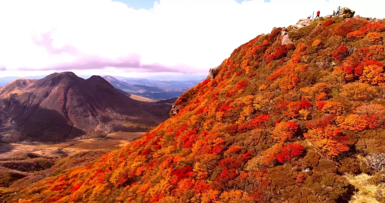 中岳や大船山といった標高1,700m級の山々が連なる九州本土最高峰である九重山では、例年10月中旬から色づきが始まります。他の山にはない九重ならではの景色が待ち受けており、特に坊がつるの草紅葉は圧巻です。