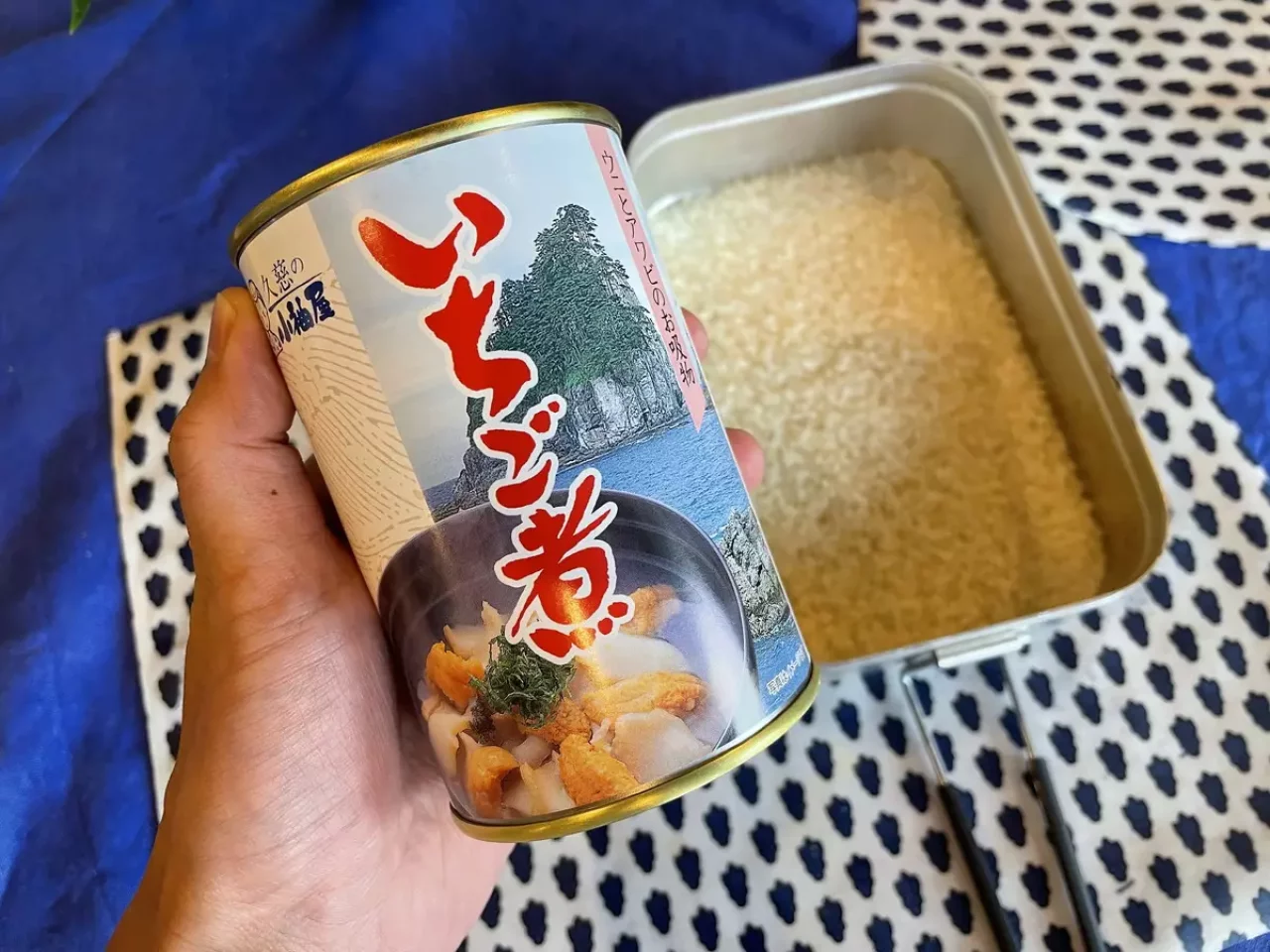 材料はお米2合にいちご煮1缶です。「いちご煮」とは、ウニやアワビといった海の恵みを豪快に盛って浜辺で食べた 煮付け料理が「いちご煮」のルーツで、八戸の郷土料理として有名です。缶詰をそのまま温めてウニとアワビのスープとしても頂けますが、今回をこれを使って炊き込みご飯をラージメスティンで作ります。