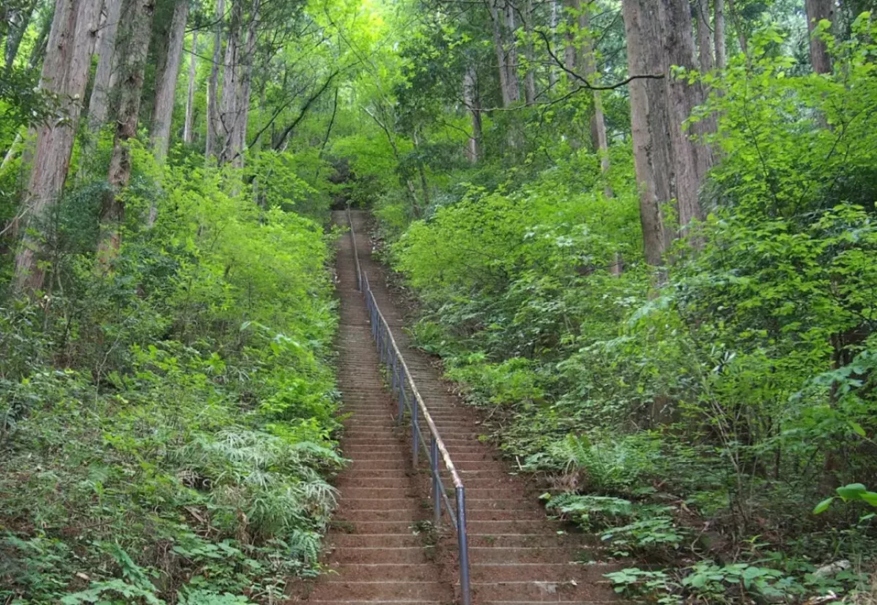 奥多摩駅を出て左手に300メートルほど車道を進むと愛宕神社へといたる登山口が現れます。まずはじめに突如目の前に現れる傾斜角の長い階段が待ち構えています。スタートから辛い登りが始まりますがやがて愛宕神社の五重塔が出迎えてくれます。