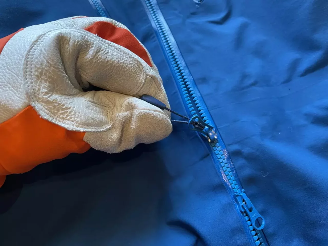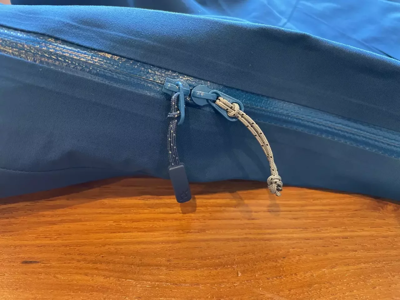 ハンドウォーマーポケットとピットジップのジッパータブはグローブをしたまま手で開け閉めがしづらいので、3mmのパラコードに替えて自作でジッパータブを作ってストレスを回避しています。殆どのハードシェルに同じような対処を施しています。