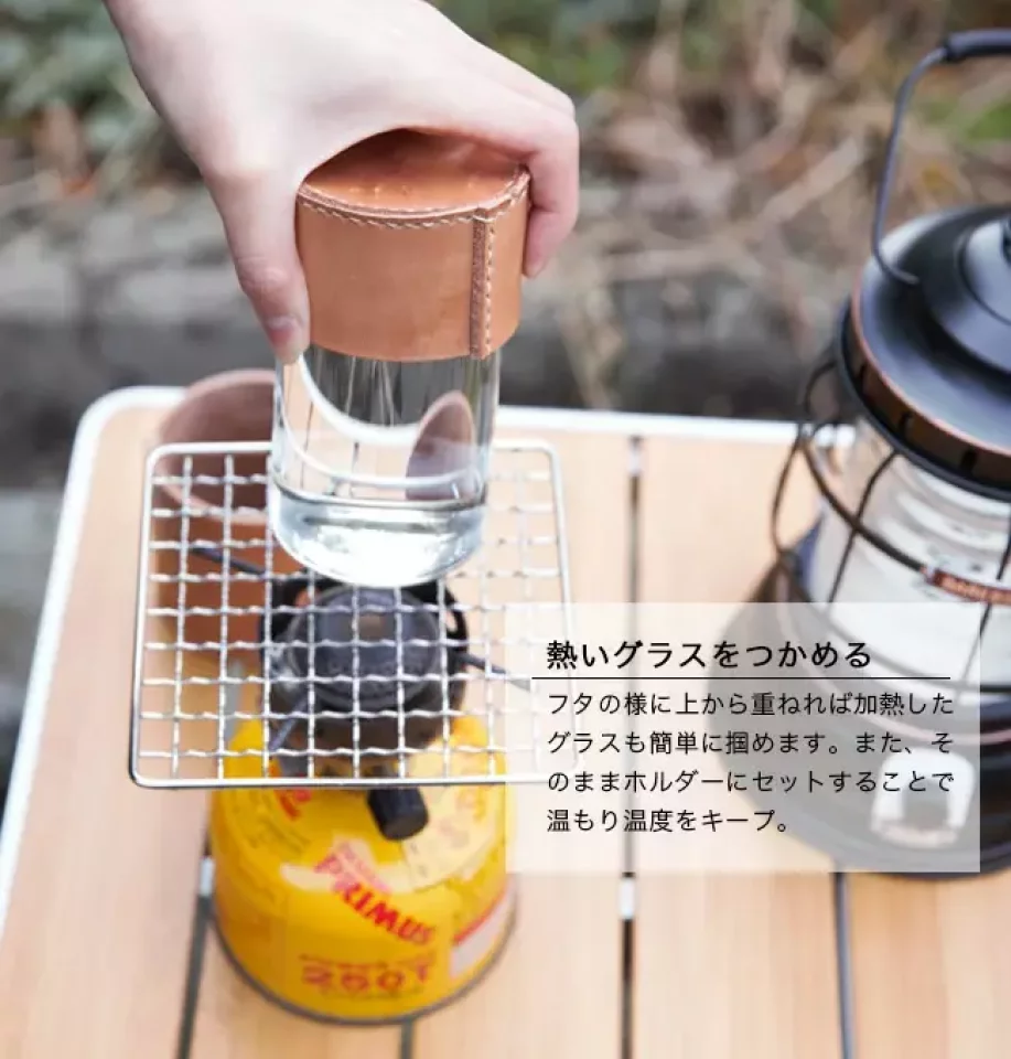 グラスにレザーカバーとレザー製の蓋がついたアイテムで、シンプルなんだけどとにかく使用用途が広いアウトドアギアです。グラスは直接火にかけることができるので、ケトルいらずで簡単にお湯を沸かすことができます。蓋のレザーケースを重ねればそのまま熱いグラスをつかむことができます。蓋は虫やゴミが入るのを防止する役割も果たします。さらに350ミリリットルの缶がスポッと入るサイズなので手で温まることを防ぎ水滴も気になりません。