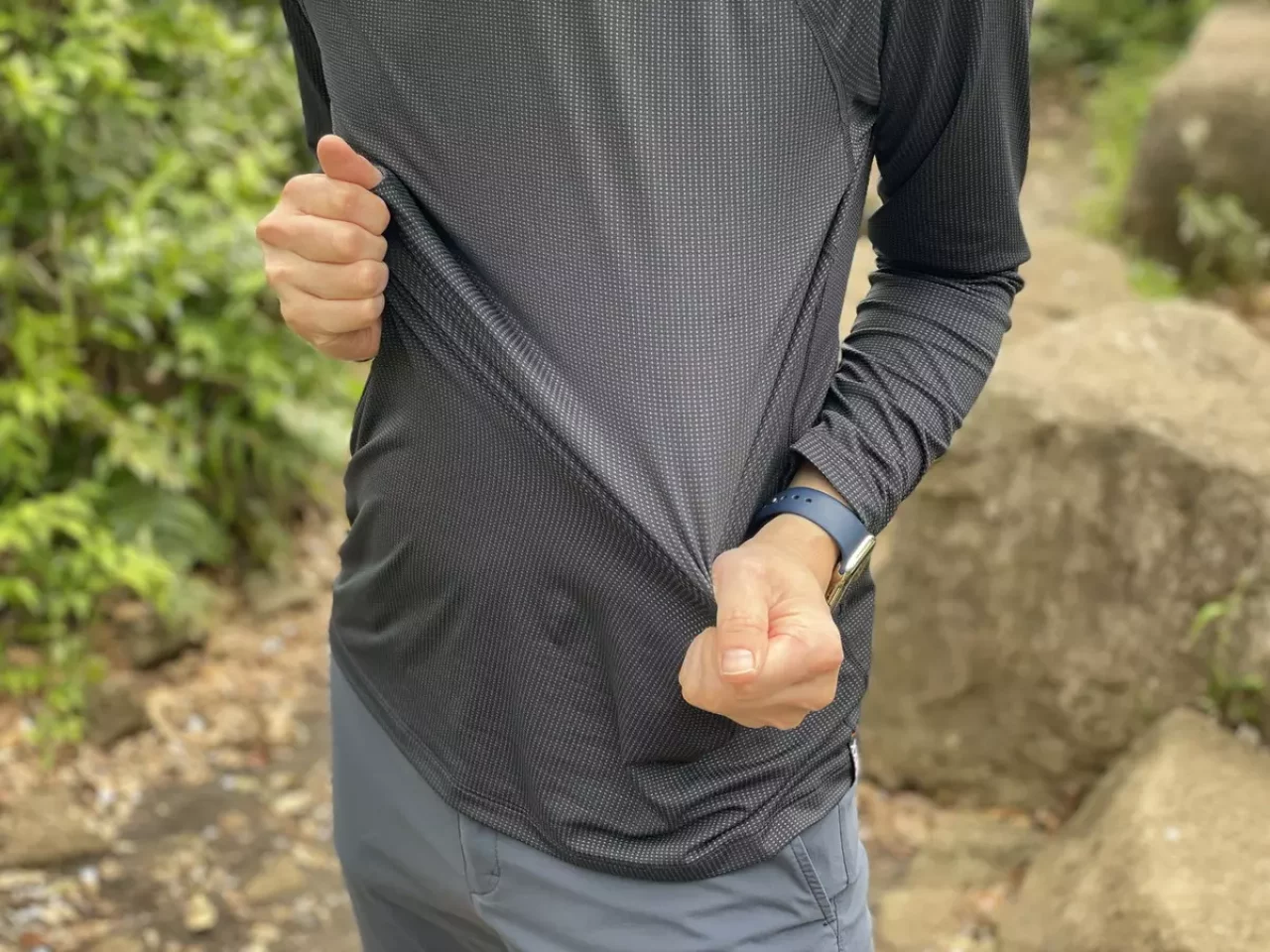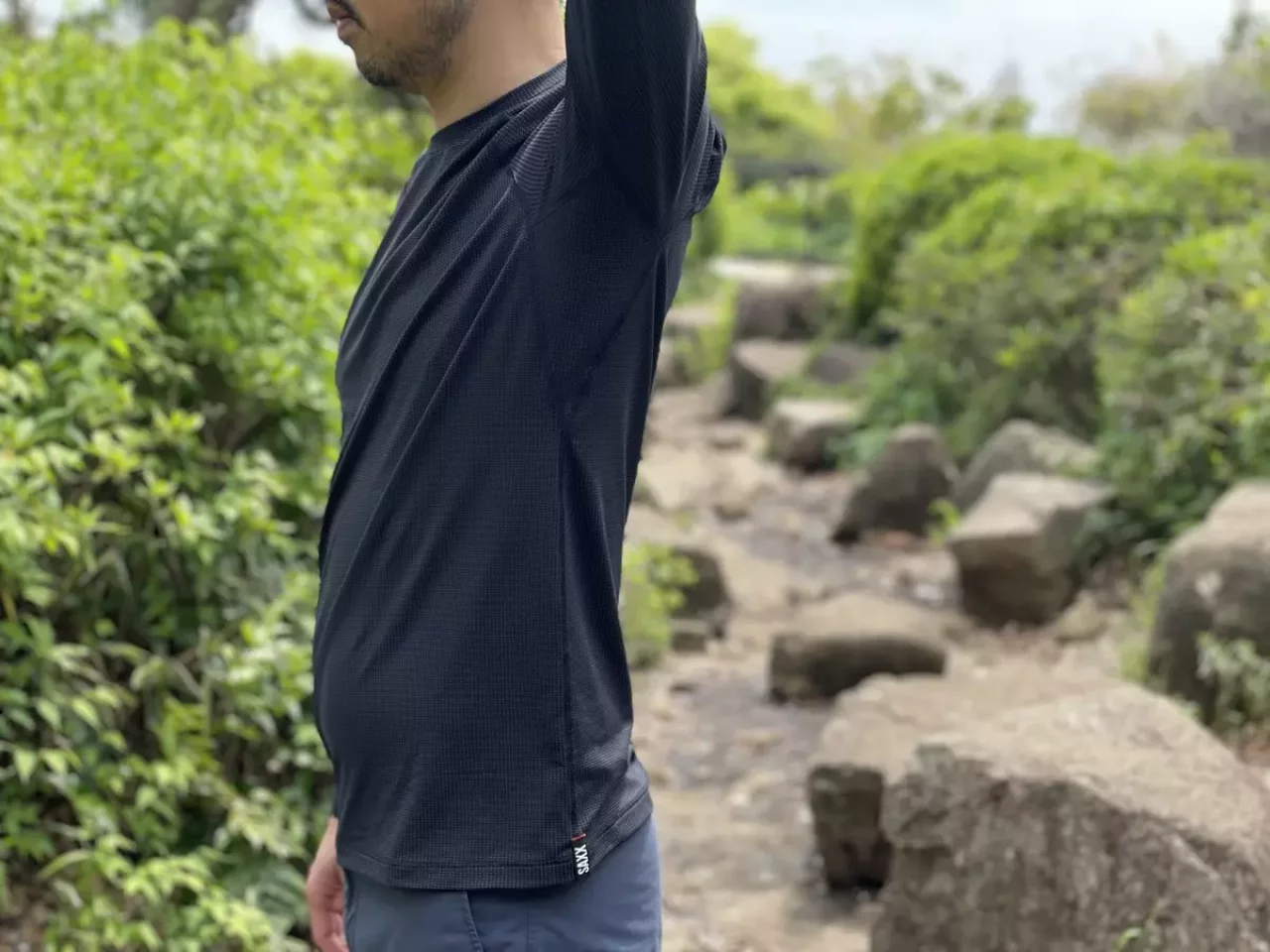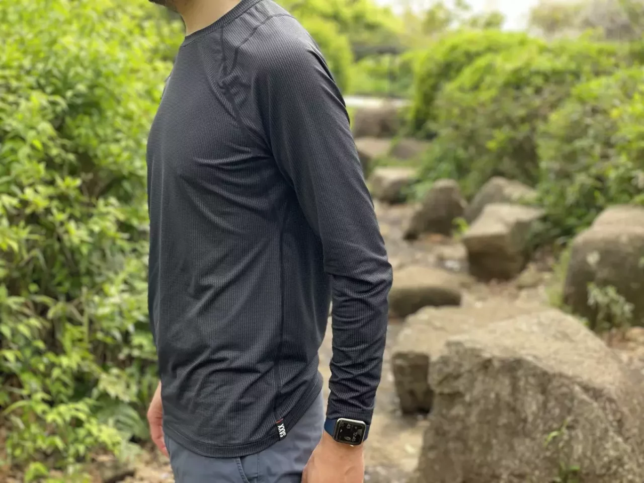 SAXXのクエストは、程よいフィット感で虫がいない登山道では腕をまくることができるし、通気性に優れているので、半袖と比較してもロングスリーブによる暑さが気になりません。登山だけでなく渓流釣り、マウンテンバイク、SUP、トレイルランニングなどとにかく様々なアクティビティで活躍してくれるロングスリーブです。