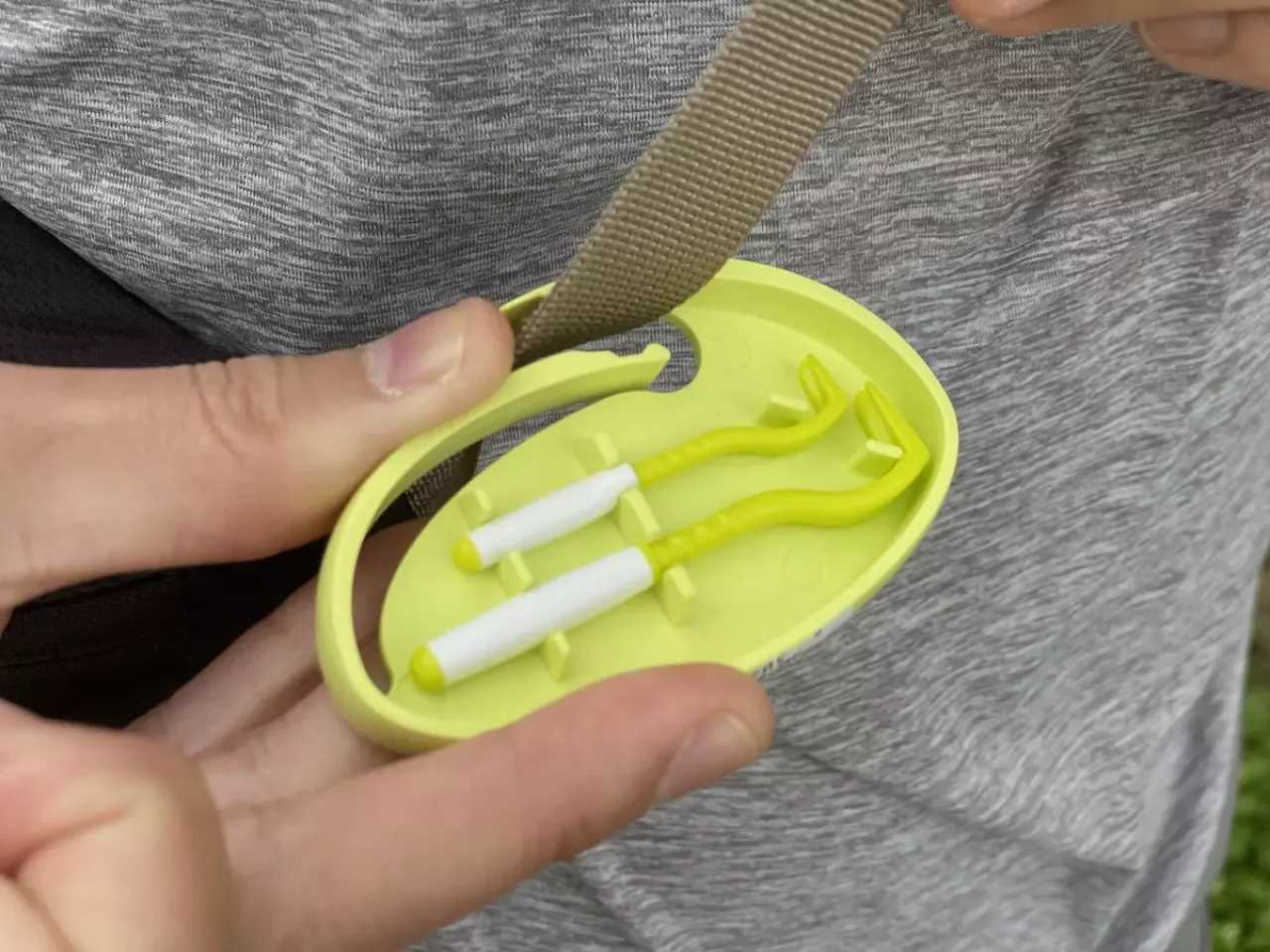 ティックツイスターを使ってマダニを取り除くことができるのは刺されて時間が経っていない時期なので、持ち歩くことが有効です。