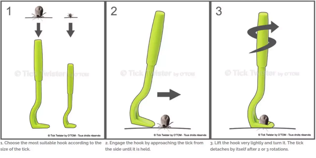 血を吸っているマダニを見つけたらマダニと肌の隙間にティックツイスターを差し込んでツイスターを回転させながら少しずつ引っ張っていくと、マダニを取り除くことができます。