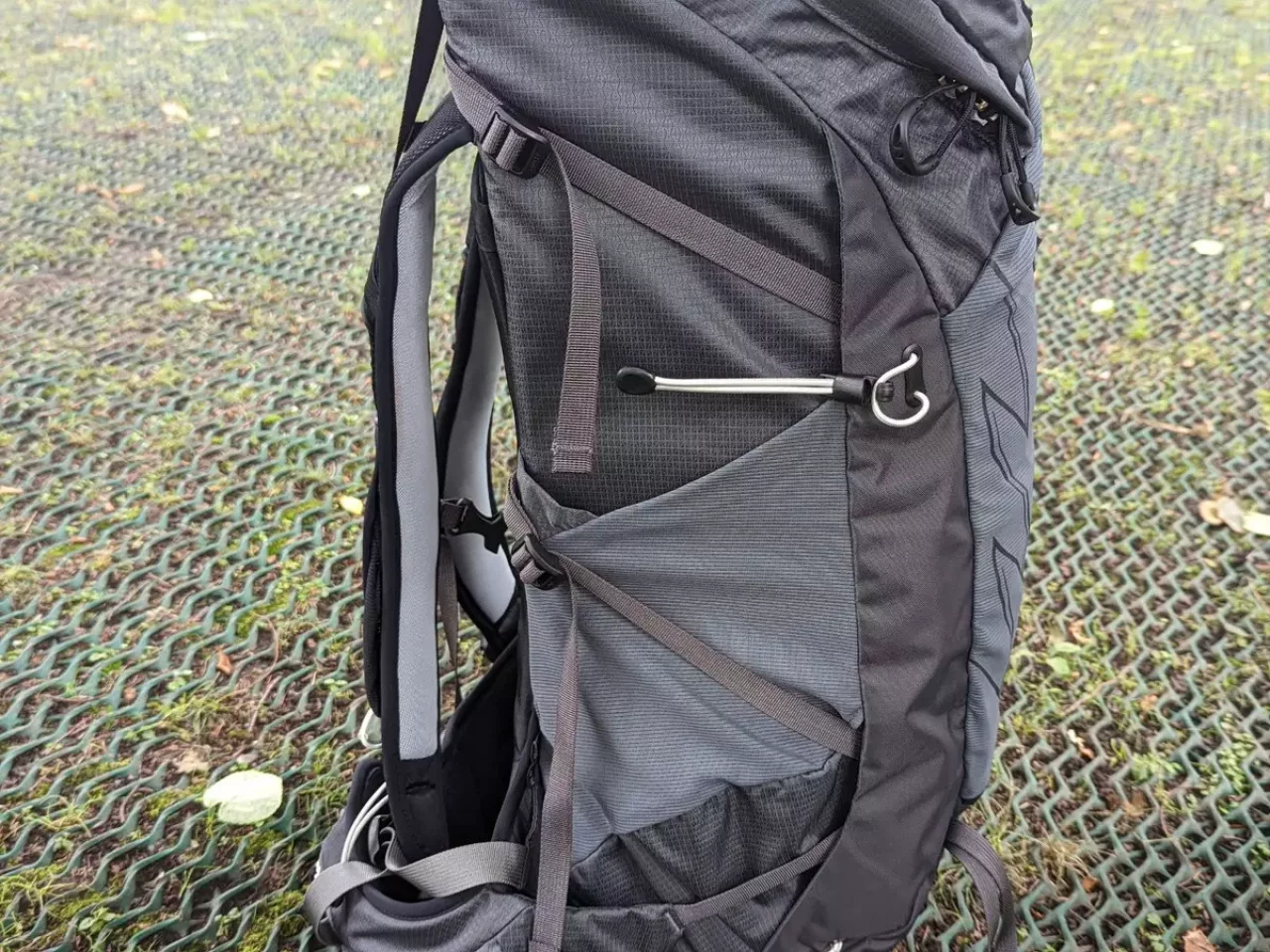 また行動中にトレッキングポールを一時固定できるアタッチメントを備えており岩稜帯で重宝する機能です。