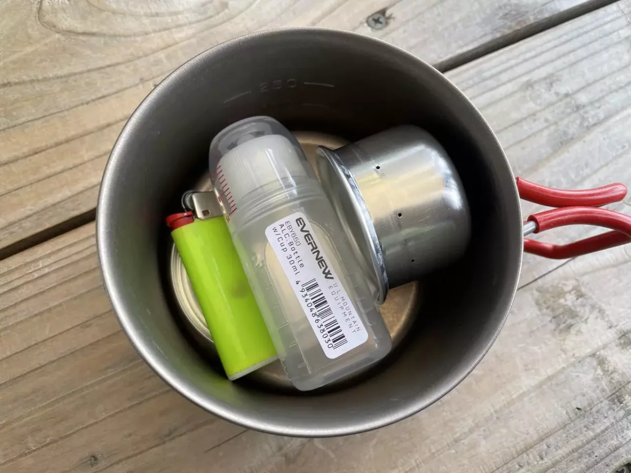 エバニューのチタンクッカー400FDの中に縦にしても横にしても収納可能で蓋もちゃんと締まります。これだけコンパクトなのでエマージェンシーキットとして持ち歩く道具としても機能します。