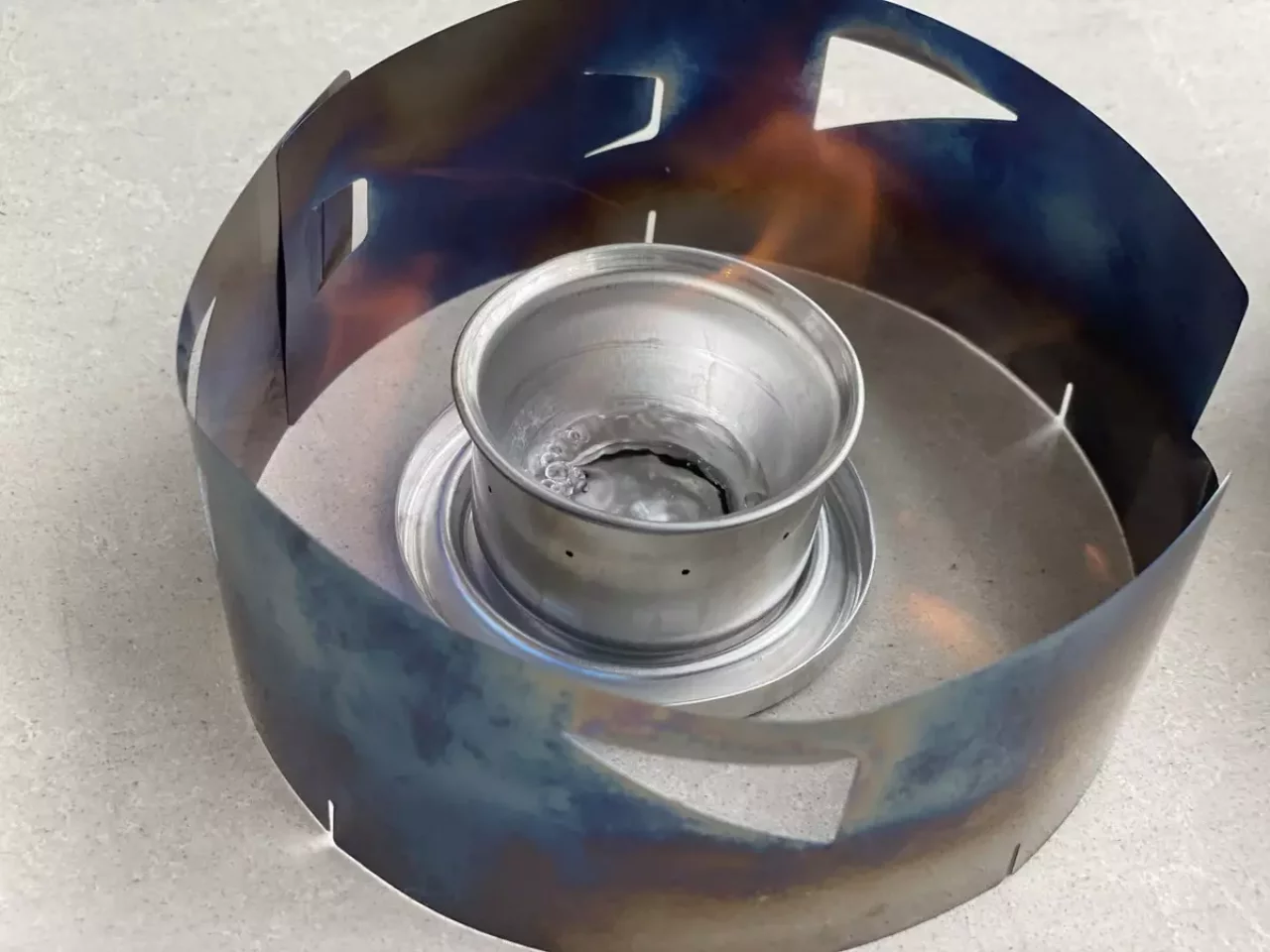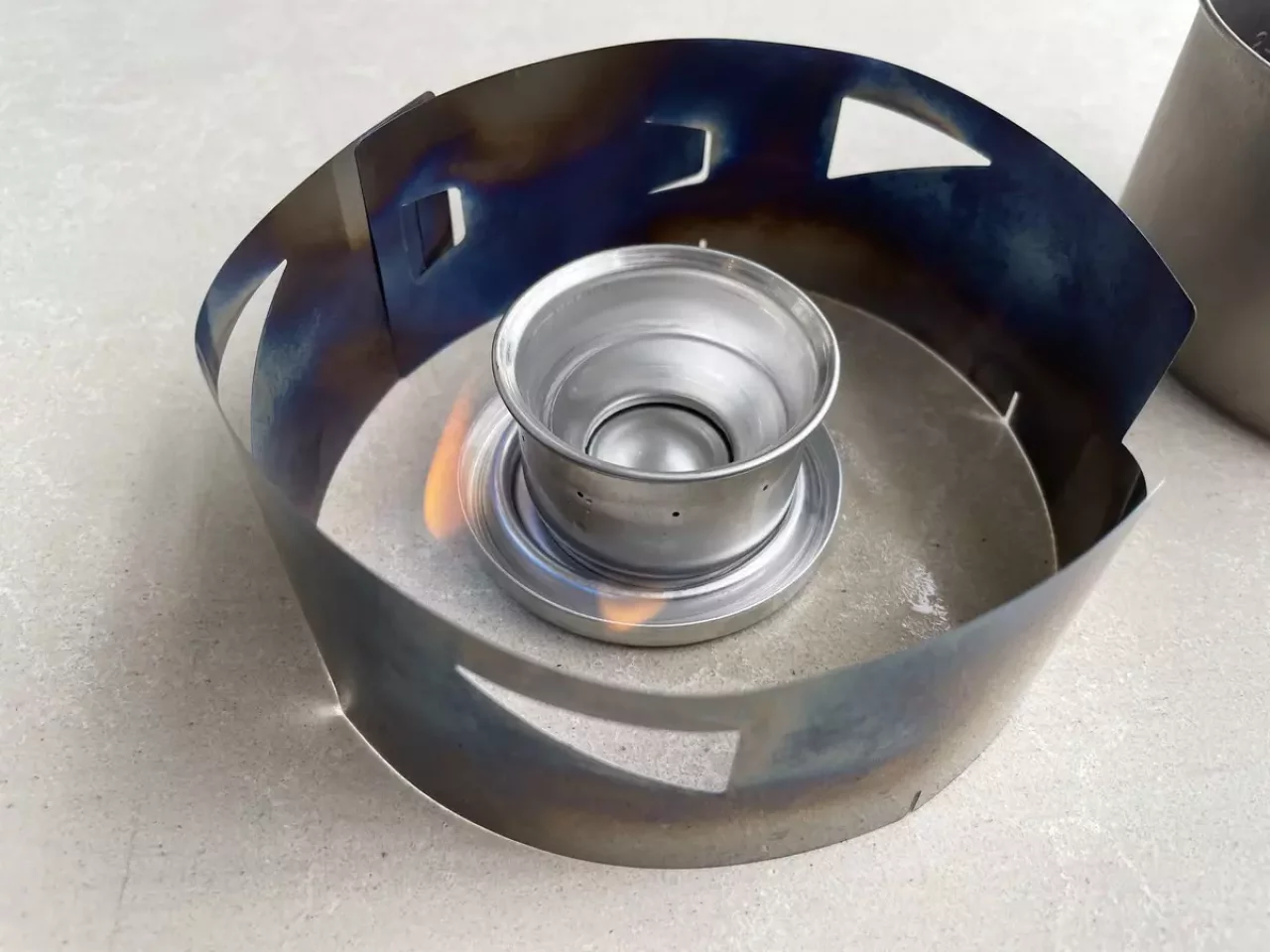 アルコールストーブはガスストーブや固形燃料と比べると風に弱いことが挙げられます。無風状態で約7分燃焼し400mlのお湯を沸かすことができるのですが、山では風が吹いているのでこのスペックを実現することは風防を使っても難しいです。