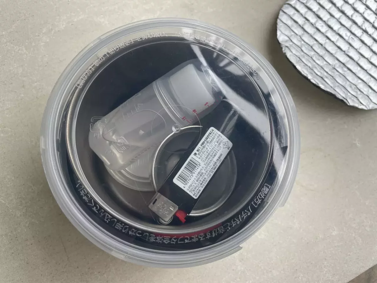 エバニューの風防ケースの中に、エバニューの400FDカップがシンデレラフィットでスタッキングできます。400FDカップの周りには風防が入っている状態です。