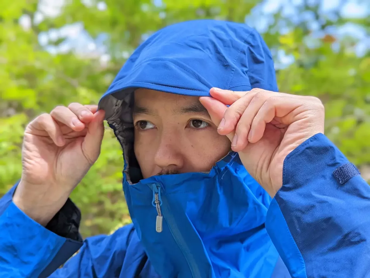 上の写真のように左右にドローコードがついているので、片手が使えなくとも素早くフィットさせることができる作りは、耐候性を意識したレインジャケットの特徴です。