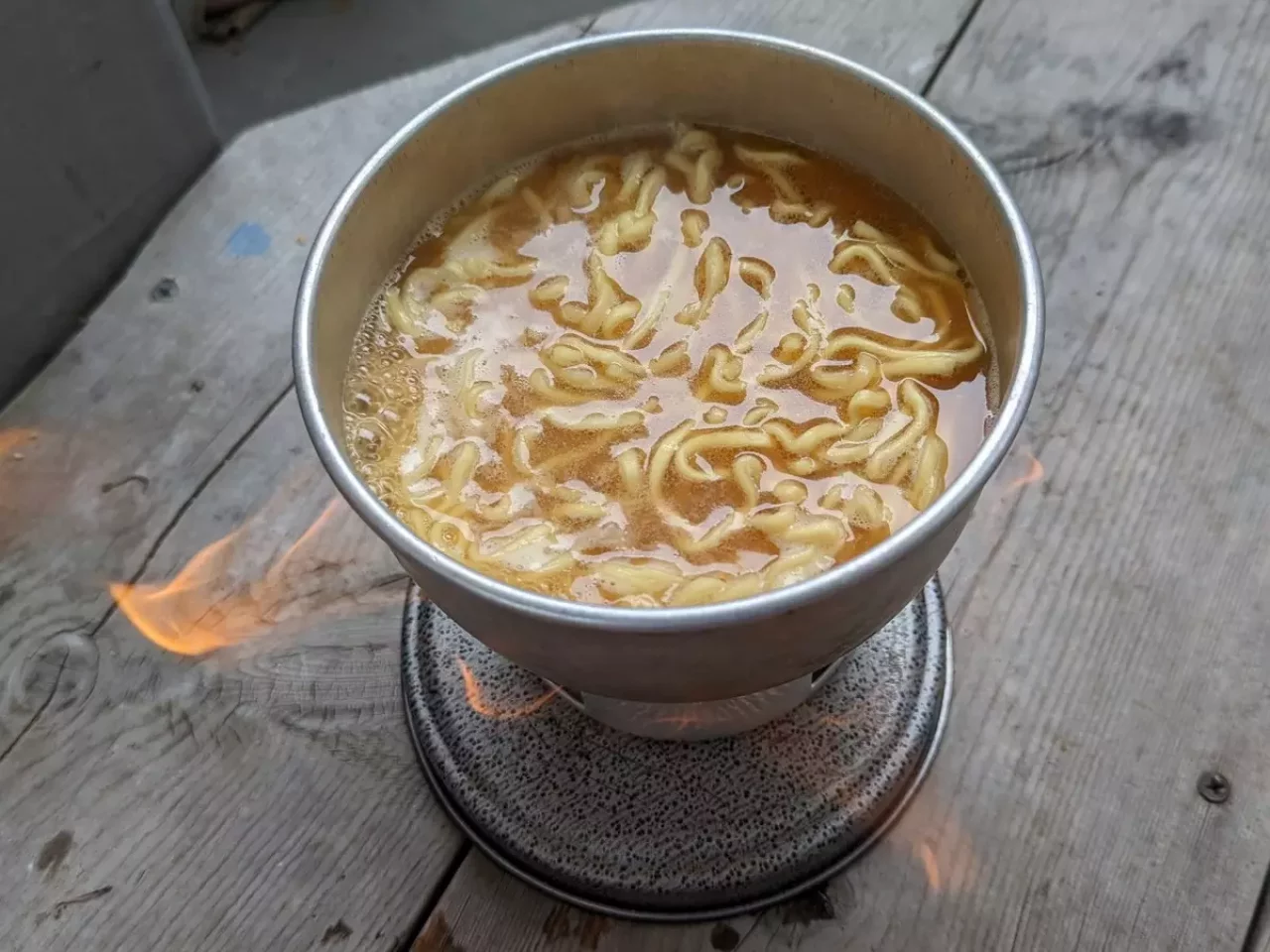 アルコールタンクに⅔のアルコールを入れることで、無風状態で約25分燃焼し続けます。今回ラーメンを作るのに500ml のお湯を要し、約4分間煮立たせる必要があるのですが、タンクには⅓ほどアルコールを入れたらオッケーです。これは風が強い場所で調理をしてもラーメンを完成させることができるアルコールの量です。