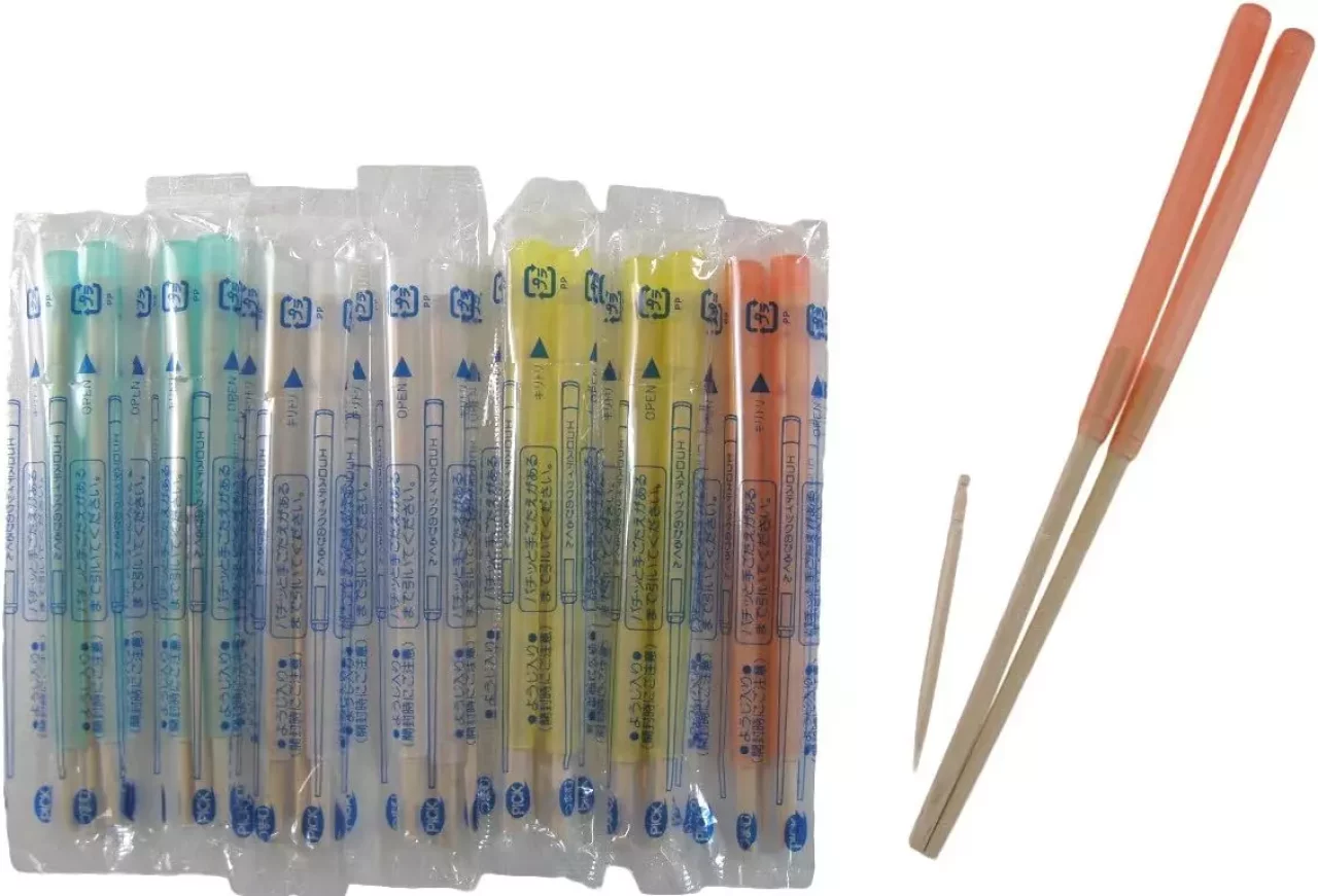 使い捨て部分がお箸の先端のみで、持ち手部分はポリプロピレンで作られています。一つの袋の中に楊枝が入っていて気が利いています。使い捨てといえども洗って使い続けることもできるコストパフォーマンスに優れたアイテムです。一個あたりの重量は紹介するカトラリー中で最も軽量です。