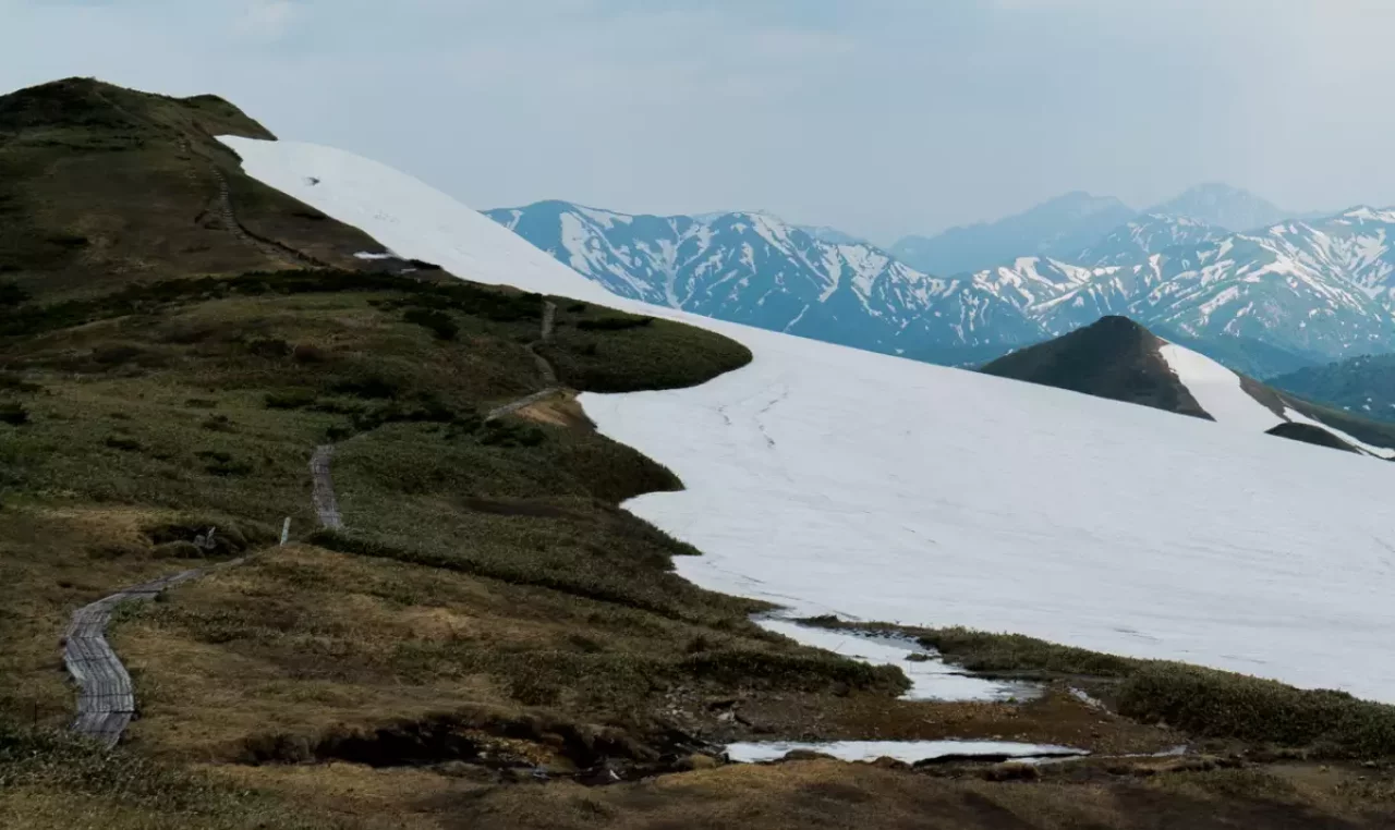 谷川岳の馬蹄形の一角をなす朝日岳周辺には池塘があり、多くの高山植物が咲乱れるスポットです。梅雨の時期は山の斜面に残雪が残り、緑と白のコントラストが美しいゼブラ柄を楽しみながら、高山植物を愛でることができる梅雨だけにしか味わえない景色を楽しめます。