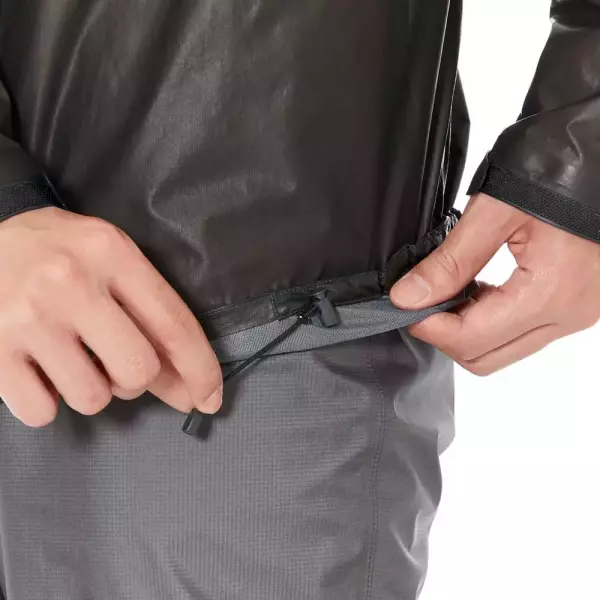 軽量コンパクト性を実現したモデルです。ベルクロテープやドローコードなどを排除し、シンプルな作りながらも、フードからの雨をシャットアウトし高い耐水性も実現した装備の軽量化にインパクトを及ぼすレインウェアです。