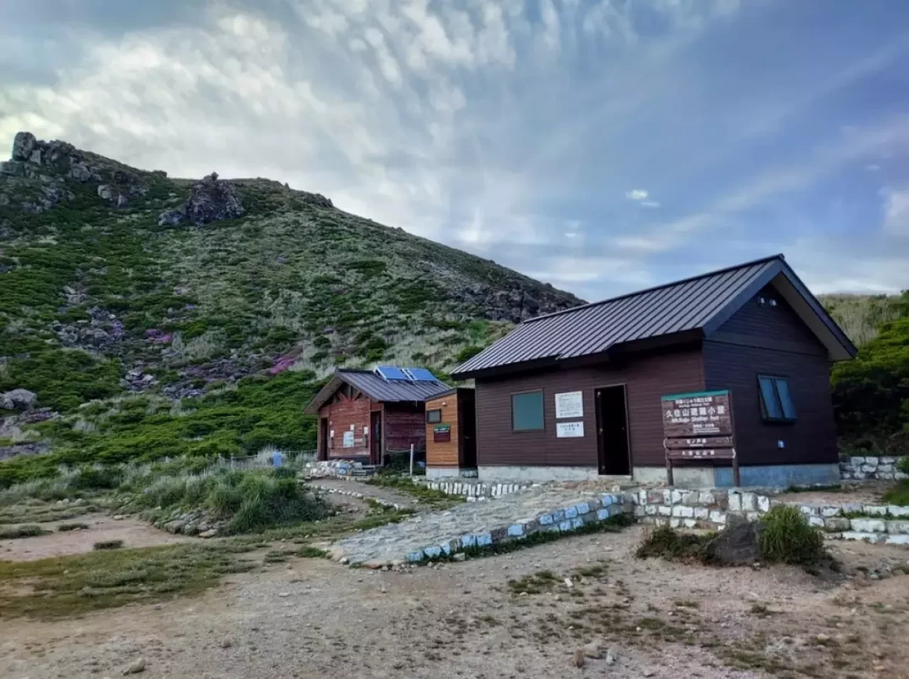 久住分かれにある久住山避難小屋です。2020年に建て替えられたばかりでとても綺麗です。トイレもあります。宿泊は禁止です。ここは、フラットで広いスペースがありますので、休憩やお弁当を食べるに最適な場所です。目の前に久住山を眺めることが出来ます。ここは、北千里ヶ浜、中岳、久住山への分岐ポイントにもなっています。今回は北千里ヶ浜から法華院温泉へ下りていきます。