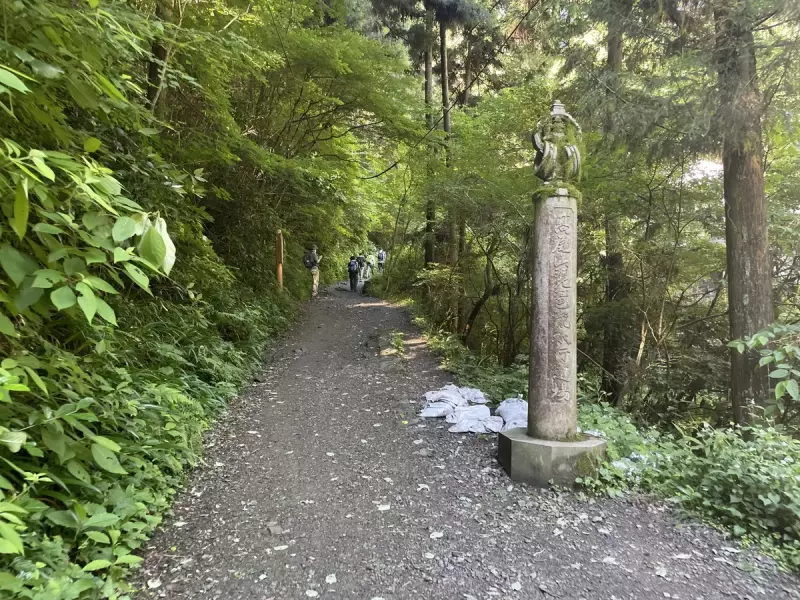 途中明王峠に茶屋がありますが、不定期で営業する茶屋なので、毎回開いているとは限りません。平日は閉まっています。約3時間半の道のりは長いため、水の補給、行動食の補給を怠らないようにしましょう。