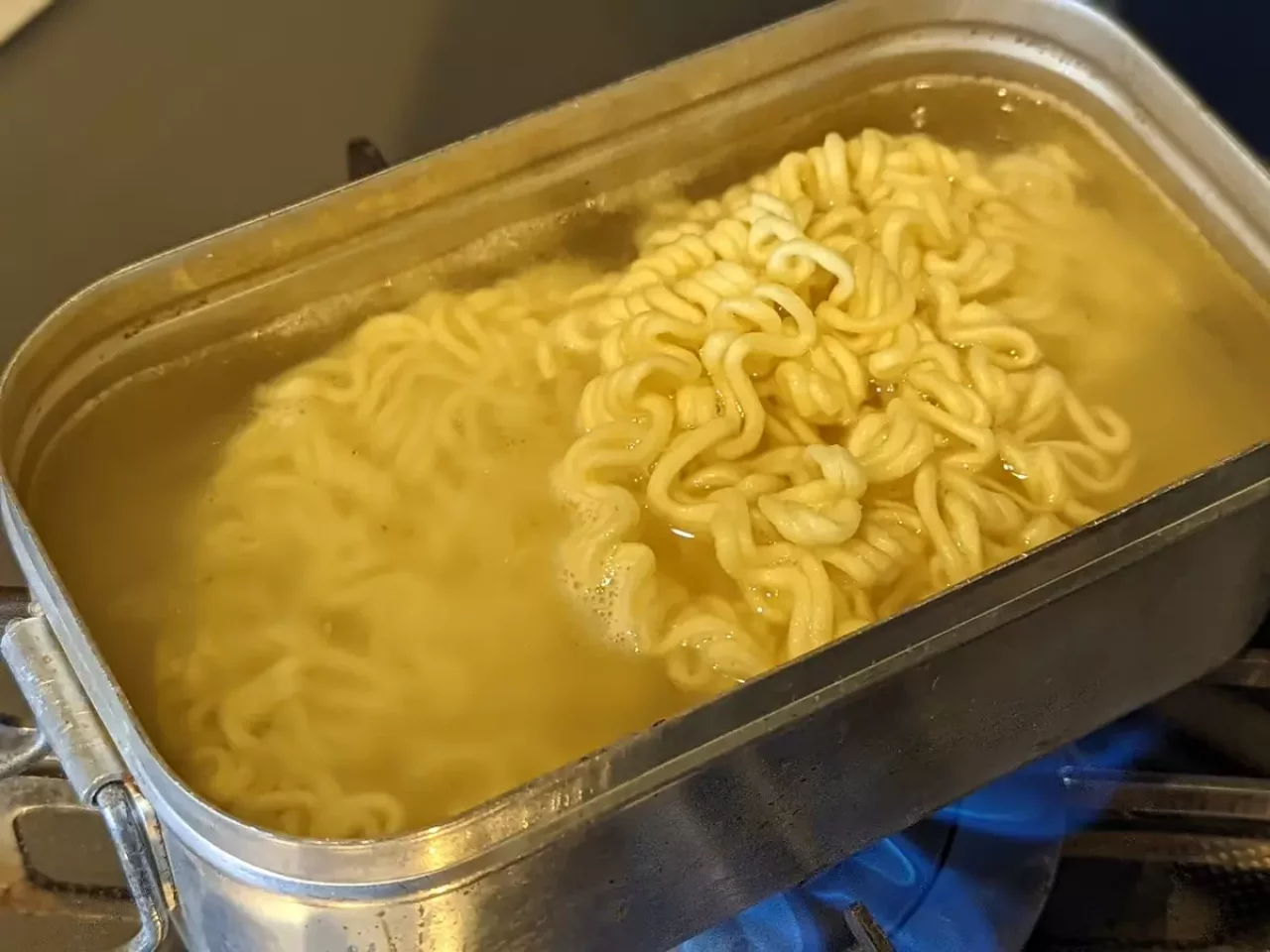 レギュラーサイズのメスティンで袋麺のラーメンを作る場合は、袋麺の裏側にかかれているお湯の量を入れると溢れてしまうことが多いので、先にメスティンの中に割った袋麺を入れて、その後に水を8分目まで入れて沸騰させます。こうすることで吹きこぼさずにラーメンを作ることができます。